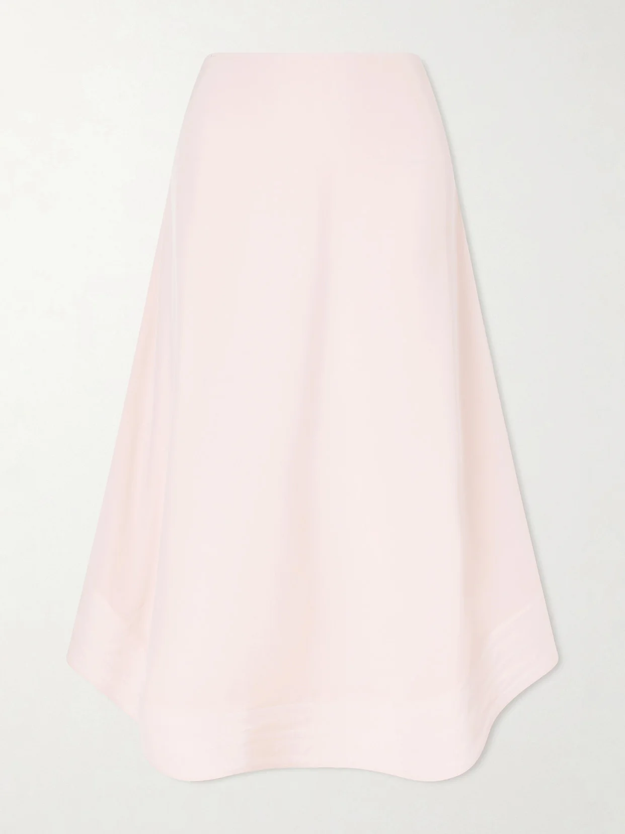 Stella McCartney is celebrated for clean lines, fluid silhouettes, and sophisticated design. This A-line skirt is cut from lustrous silk crepe, flowing gracefully at the hem for natural movement. Minimal yet elegant, it pairs beautifully with the matching top and sandals for smart, polished occasions.