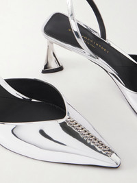 Stella McCartney's 'Elsa' pumps will bring a mirrored futuristic edge to your wardrobe. Made from metallic synthetic material, they're shaped with pointed toes embellished with silver-tone chains and rest on sculptural heels. Let them catch the light with fluid tailoring or a sleek evening dress.
