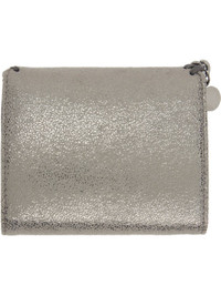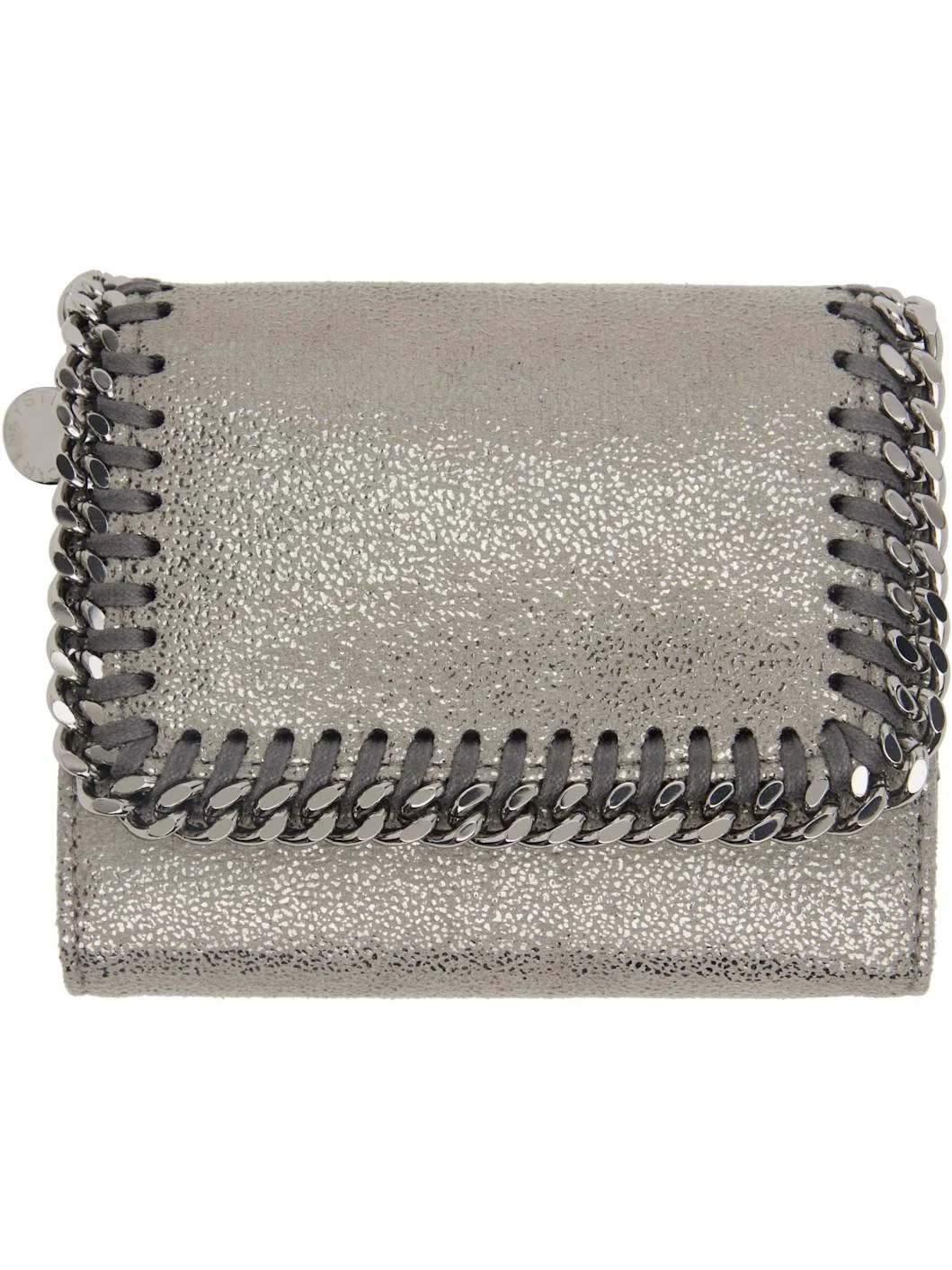 Faux-suede trifold wallet in metallic-silver tone. GOTS-certified organic cotton whipstitching and curb chain trim at foldover flap. · Logo disc at side · Press-stud closure · Zip coin compartment · Six card slots · One patch pocket · Central note slot · Logo-woven satin lining · Faux-leather interior · Silver-tone hardware · H3.75" x W4.5" x D1" Made from cruelty-free, non-animal materials. Supplier color: Steel grey Synthetic. Made in Italy 252471F040002