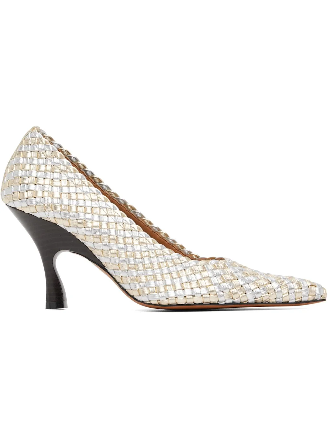 Handcrafted basket-woven faux-leather heels. · Pointed toe · Scalloped edge at collar · Stiletto heel with rubber injection · Faux-leather sole · Heel: H3.5" Made from cruelty-free, non-animal materials. Supplier color: Silver/Gold Synthetic. Made in Italy 261471F122004