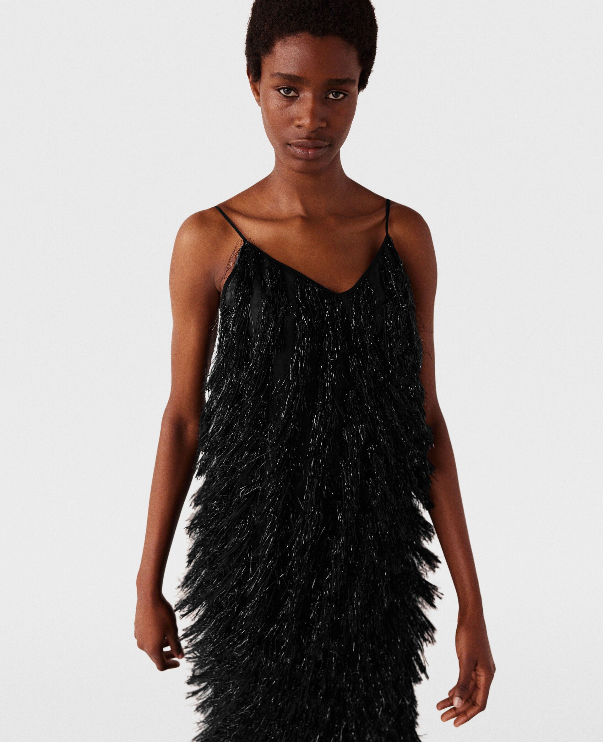 Item 6T02093EJ3561000 Shaped to a sleeveless, V-neck silhouette, this top floats over the body, crafted from tufts of glittering tassels – each made with a blend of forest-friendly viscose, silk and metallic fibers. Pair it with the coordinating pants for an effortless evening or everyday glamor look. - Color: Black glitter - Thin straps - V-neck - all-over glittering tinsel tufts - Metallic shimmer - waist-length hem - Zipper fastening - Made in Hungary Product Care & Fit Advice Care: Dry clean only Composition: 74% Viscose, 13% metallic polyester, 7% polyester, 6% silk Fit: Regular fit Sizing: Take your usual size