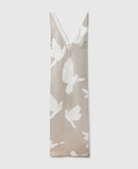 Item 6A05213FS2702801 Summer 2025 is led by a message to Save What You Love, celebrating birds and calling for their protection. The V-neck dress is spun from fluid GOTS-certified organic silk with a recycled polyester Chantilly lace trim, cut in a sleeveless silhouette that floats over the body. - Color: Beige/White - Dove print - V-neck with Chantilly lace trim - Sleeveless - Zipper fastening - Ankle-length hem - Made in Italy Product Care & Fit Advice - Care: Dry clean only - Composition: 100% Silk - Fit: Regular fit - Sizing: Take your usual size - Model wears a size 40 IT or 8 UK