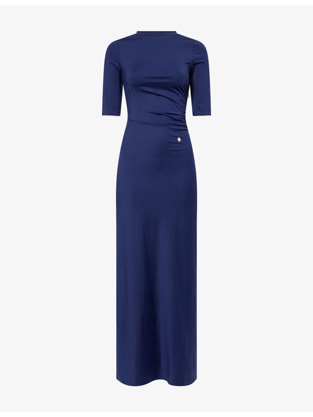 PRODUCT DETAILS - Stella McCartney stretch-jersey maxi dress - 84% polyamide, 16% elastane - Concealed zip fastening at side - Slim fit, round neck, short sleeves, logo plaque at front, ruched at side - Machine wash at 30°C - Made in Portugal - True to size - Size small: length 56.5in / 144cm - Model is 5ft 10in/1.78m and wears a size small - Lightweight, stretchy Ref: R04550410