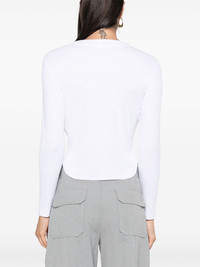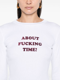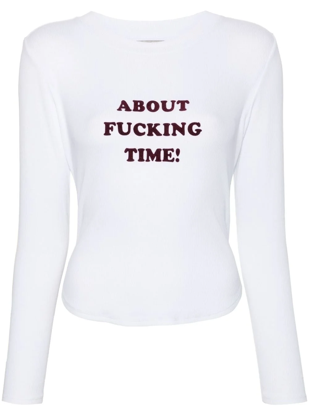 slogan-print T-shirt Highlights - White/burgundy - Cotton blend - Fine ribbed - Flocked slogan print to the front - Crew neck - Long sleeves - Short side slits - Curved hem Imported Composition Cotton 97%, Elastane 3% SIZE & FIT Model measurements Height 5 ft 11 in(1.8 m) Bust/Chest 33.07 in(84 cm) Hips 37.4 in(95 cm) Waist 25.19 in(64 cm) FittingInformation Designed for a slim fit that sits just away from the body offering a close yet comfortable fit Made from a midweight stretch fabric, this piece offers elasticity and flexibility when worn This piece fits true to size – take your usual size
