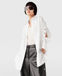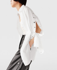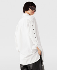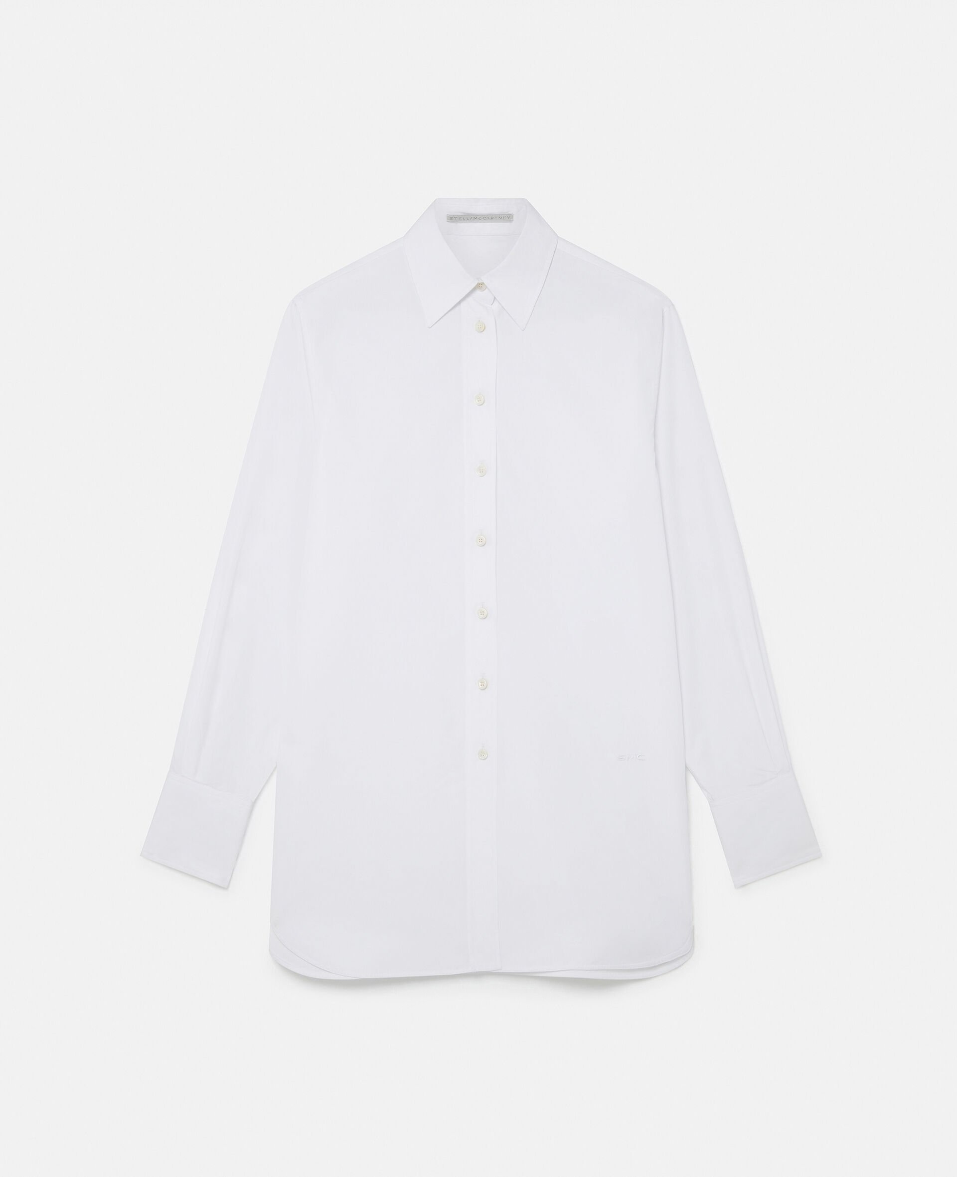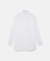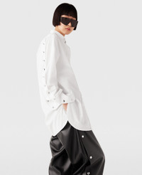 Item 620128SMA909000 In pure organic cotton, this shirt from Winter 2024 illustrates Stella McCartney’s expertise in tailoring with immaculate construction, thanks to her time spent studying on Savile Row. Punctuated with flat popper studs along the sleeves, it's best paired with the coordinating studded pants, continuing a story from the runway. - Color: Pure white - Pointed collar - Long sleeves - Buttoned cuffs - Button fastening - Lengthened hem - Made in Italy Product Care & Fit Advice Care: Dry clean only Composition: 100% Cotton Regular fit