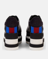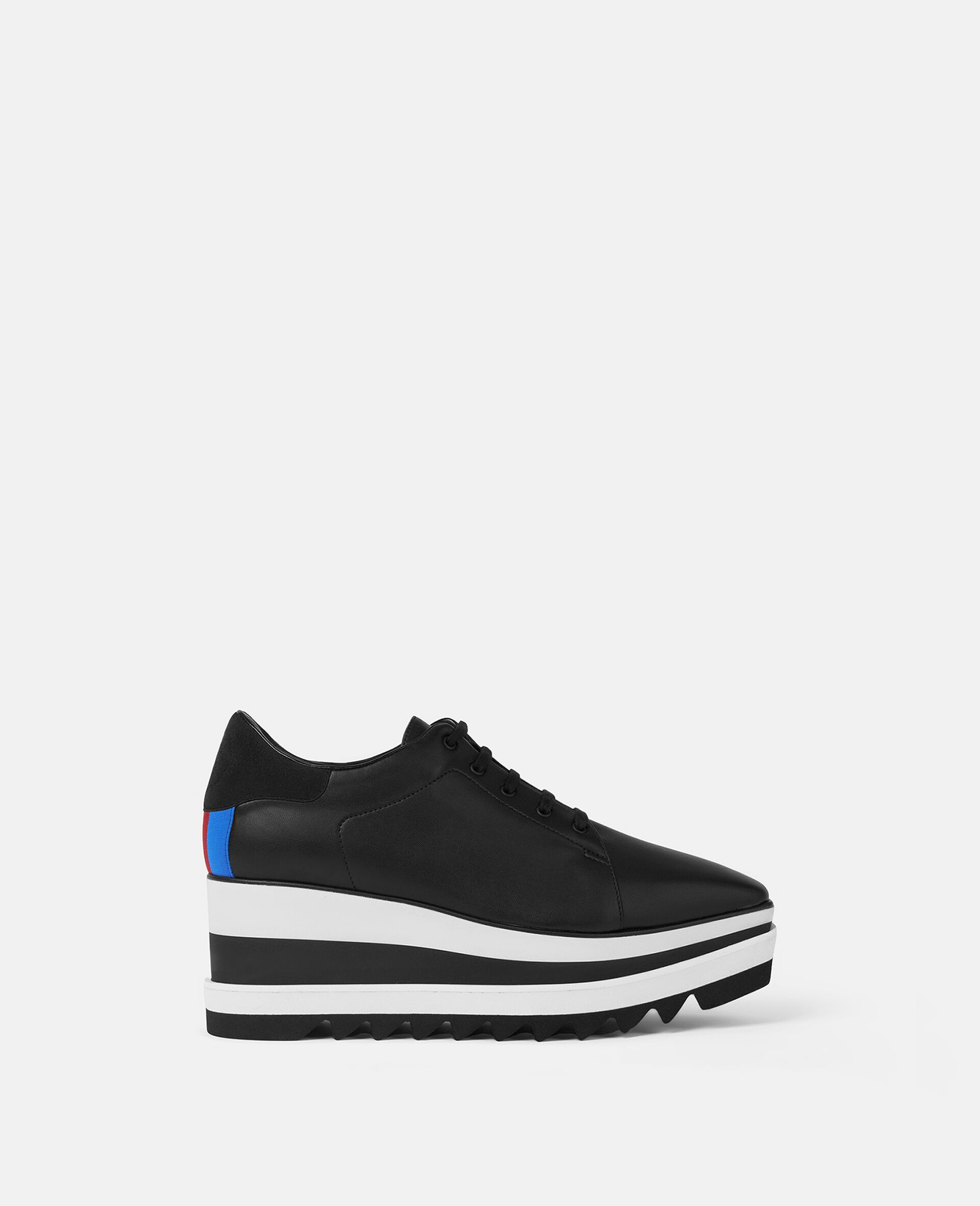 Item 478958W02Q41093 - Colour: Black - Eco Alter Mat vegan alternative to leather upper - Angular square toe - Maroon and blue stripe panel at back - Lace-up fastening - Black and white wedge heel - White signature saw-edge micro sole - Fully lined - Made in Italy Product Care & Fit Advice - Care: Spot clean only with soft damp cloth - Material: 51% Polyurethane, 34% Cotton, 15% Polyeste - 80 mm platform - All of our shoes and accessories are made from non-leather materials as part of our cruelty-free ethos.