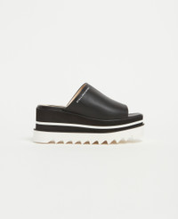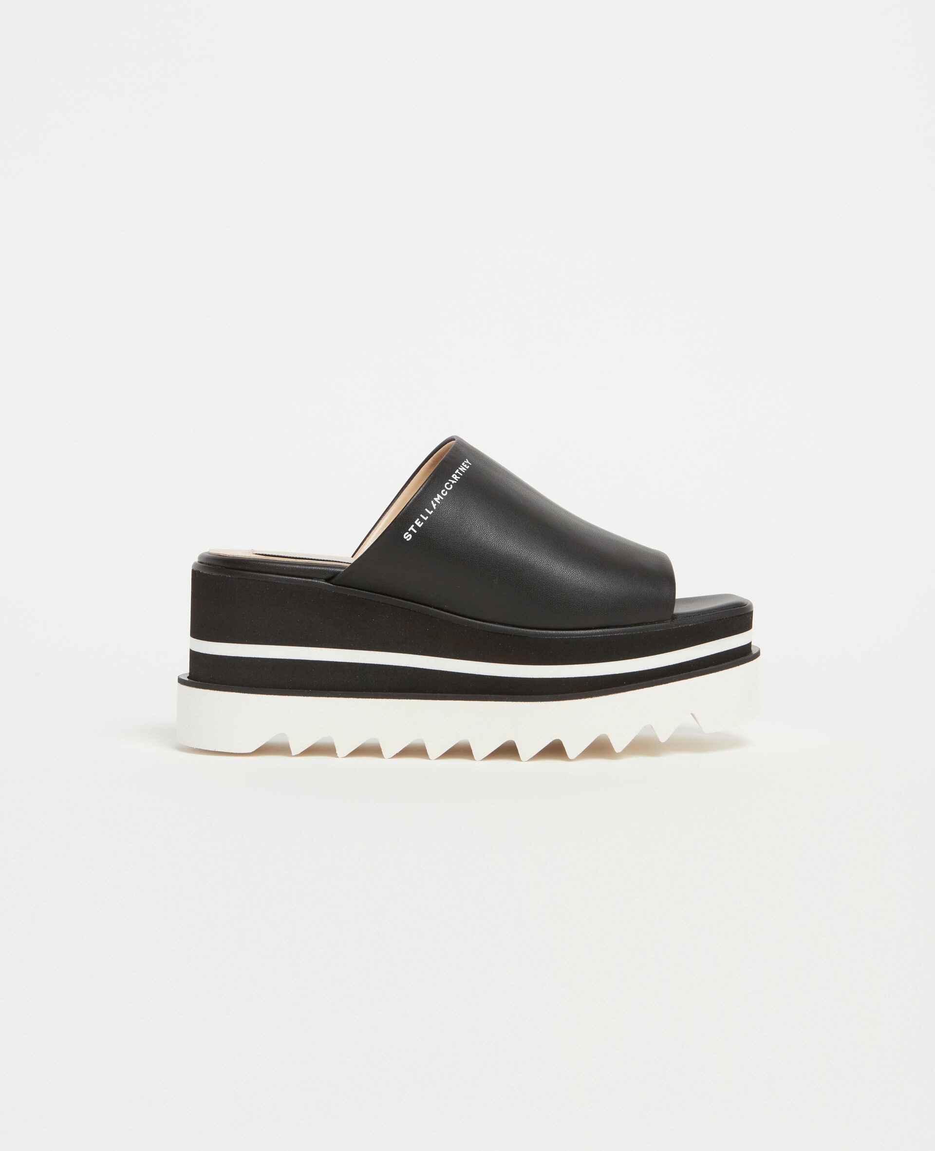 Item 810169KP0271000 - Recycled Alter Mat vegan alternative to animal leather upper with bio-based coating - Screen-printed Stella McCartney logo on upper - Angular square toe - Slip-on style - Black and white wedge heel - Signature saw-edge micro sole - Fully lined in bio-based, solvent-free Alter Mat - Made in Spain Product Care & Fit Advice - Care: Spot clean only with soft damp cloth - Composition: Upper: 73% polyurethane, 27% recycled polyester, Lining: 64% polyurethane, 36% viscose, Outsole: 66% polyurethane, 34% EVA - 80mm platform - Comes up half-size bigger - All of our shoes are made from non-leather materials as part of our cruelty-free ethos.