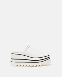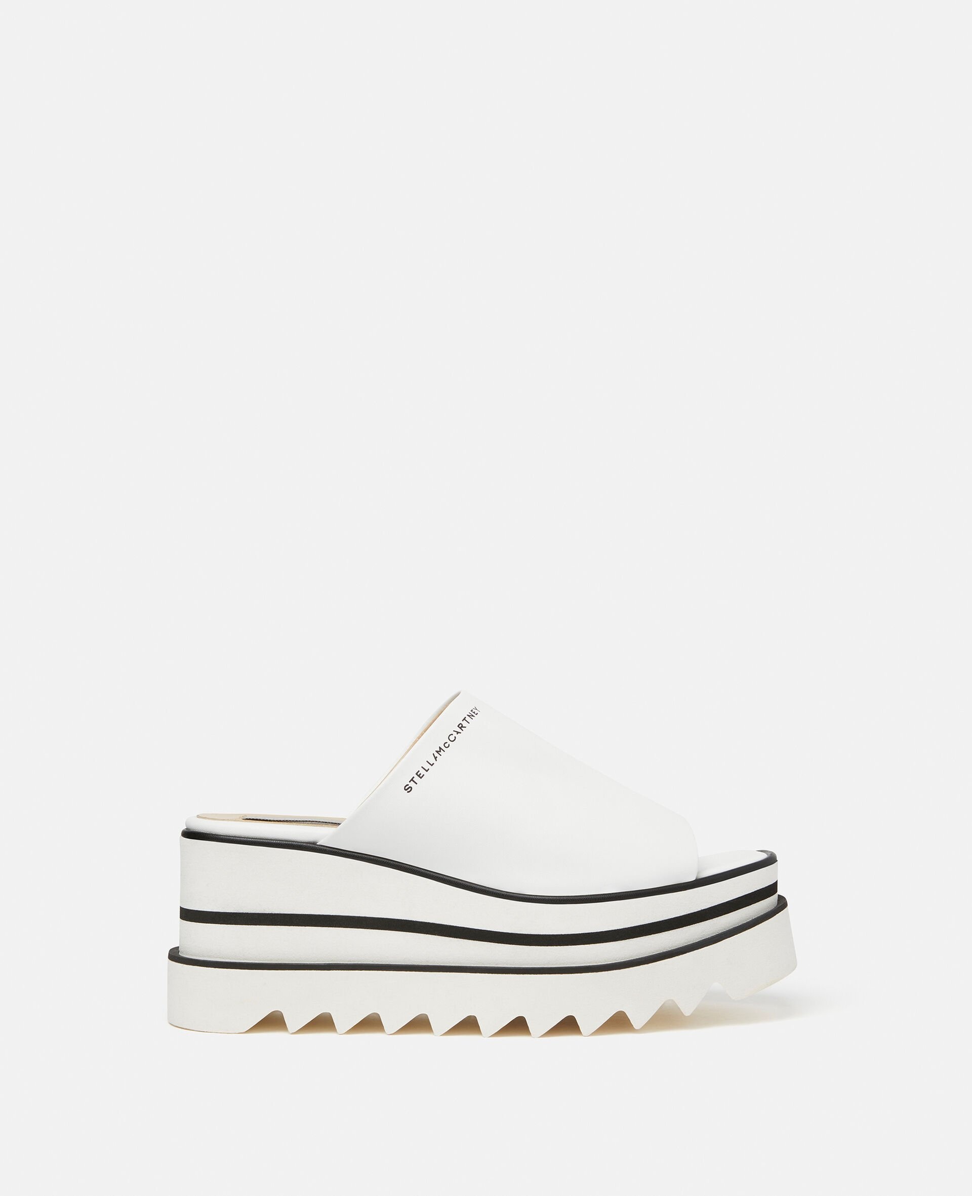 Item 810169KP0279001 These Sneak-Elyse platform mules offer a bold tone-on-tone sensibility. Crafted from recycled Alter Mat, a vegan alternative to leather, these mules have an iconic wedge heel and signature saw-edge micro sole. - Colour: White - Recycled Alter Mat vegan alternative to animal leather upper with bio-based coating - Screen-printed Stella McCartney logo on upper - Angular square toe - Slip-on style - Black and white wedge heel - Signature saw-edge micro sole - Fully lined in bio-based, solvent-free Alter Mat - Made in Spain Product Care & Fit Advice - Care: Spot clean only with soft damp cloth - Composition: Upper: 73% polyurethane, 27% recycled polyester, Lining: 64% polyurethane, 36% viscose, Outsole: 66% polyurethane, 34% EVA - 80mm platform - Comes up half-size bigger - All of our shoes are made from non-leather materials as part of our cruelty-free ethos.