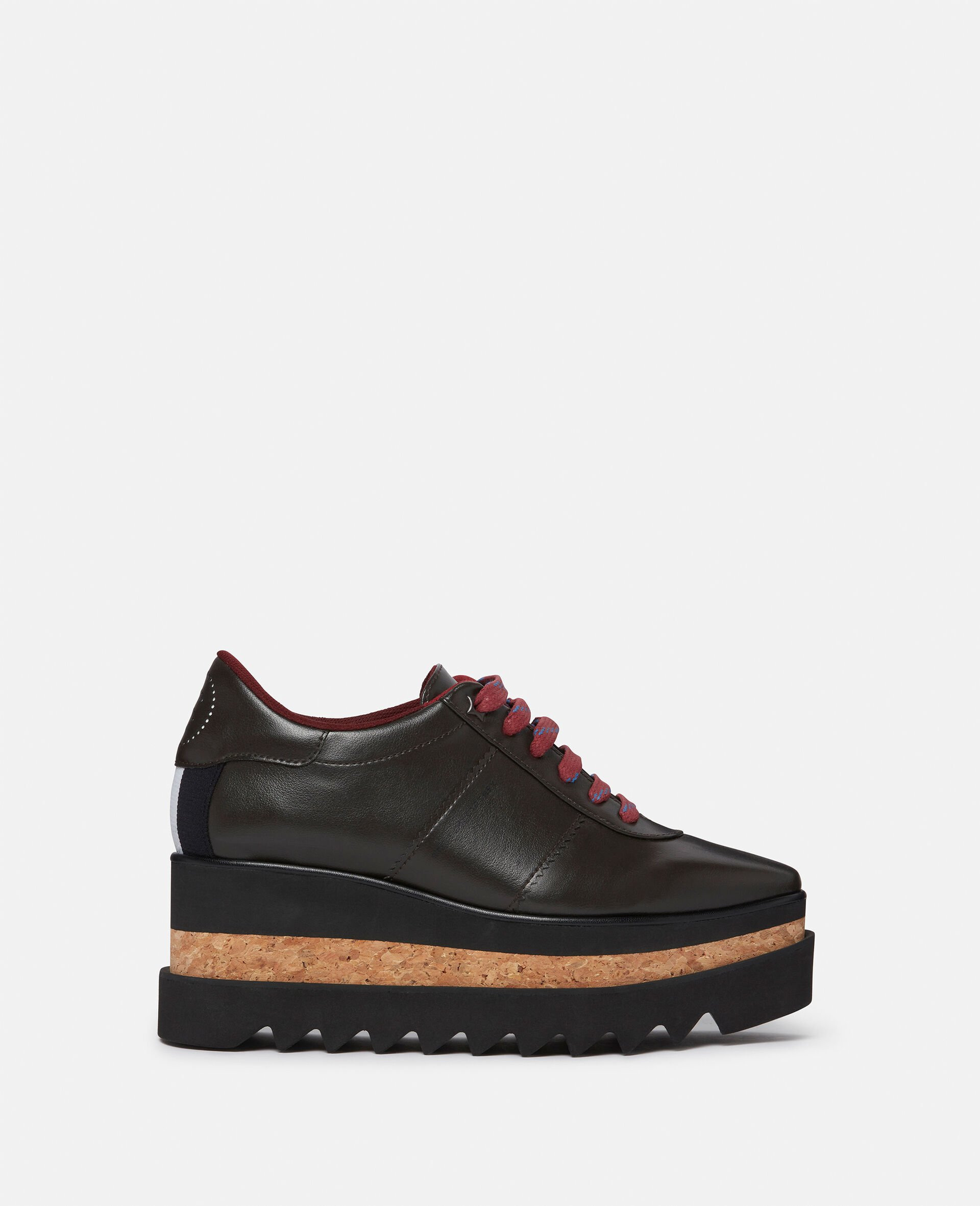 Item 810363E001792040 Step into the now in our Sneak-Elyse platform sneakers, consciously crafted from VEGEA – a vegan, grape-based alternative to animal leather. They give a sporty twist to our iconic Elyse platform shoes, with logo detailing and heel stripes elevated on a multicolored wedge heel and saw-edged sole. - Color: Black - Ebony black - VEGEA vegan alternative to animal leather using grape waste - Screen-printed Stella McCartney logo on upper - Two-tone recycled polyester ribbon at back - S perforated logo at back heel - Angular square toe - GOTS-certified organic cotton lace-up fastening - Black and cork wedge heel - Signature saw-edge micro sole - Fully lined - Lace-up fastening - Made in Portugal Product Care & Fit Advice Care: Spot clean only with soft damp cloth Composition: Main fabric: 53% recycled polyester 47% PU bio Size: Fits true to size