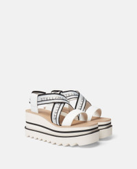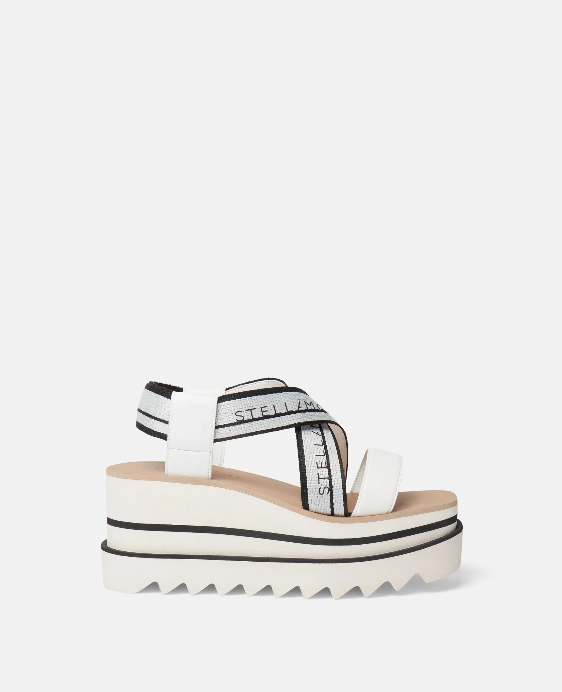 Item 810162E000159061 Elevate springtime sets with these Sneak-Elyse platform sandals in bright white. The athleisure-inspired sandals have a logo webbing strap upper, elevated by a striped wedge heel and signature saw-edge micro sole. - Colour: White/Black - Webbing strap upper - Stella McCartney logo on straps - Angular square toe - Slip-on style - Black and white wedge heel - Signature saw-edge micro sole - Fully lined - Made in Italy Product Care & Fit Advice - Care: Spot clean only with soft damp cloth - Composition: Upper: 97% recycled polyester, 3% polyurethane, Lining: 64% polyurethane, 36% viscose, Outsole: 50% EVA, 50% microporosa - 80mm platform - Comes up half-size bigger - All of our shoes are made from non-leather materials as part of our cruelty-free ethos.