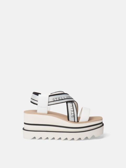 Item 810162E000151065 Elevate springtime sets with these Sneak-Elyse platform sandals in match-all black. The athleisure-inspired sandals have a logo webbing strap upper, elevated by a striped wedge heel and signature saw-edge micro sole. - Colour: Black/White - Webbing strap upper - Stella McCartney logo on straps - Angular square toe - Slip-on style - Black and white wedge heel - Signature saw-edge micro sole - Fully lined - Made in Italy Product Care & Fit Advice - Care: Spot clean only with soft damp cloth - Composition: Upper: 97% recycled polyester, 3% polyurethane, Lining: 64% polyurethane, 36% viscose, Outsole: 50% EVA, 50% microporosa - 80mm platform - Comes up half-size bigger - All of our shoes are made from non-leather materials as part of our cruelty-free ethos.