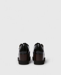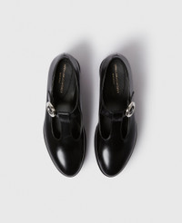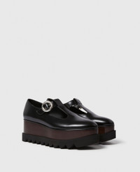 Item 810504AP0AQ01000 Elyse platform shoes inspire an effortless cool. This pair of vegan Mary Janes adds an edgy touch to any look – with star-shaped studs along the midsole. These comfortable platforms are finished with a tonal T-Bar buckle detail on the foot, a lowered wedge heel and a signature saw-edge micro sole. - Color: Black - 80mm platform heel - T-Bar detail - Glossy finish - FSC-certified wooden wedge heel - Saw-edge micro sole - Buckle fastening - Handcrafted in Italy - All of our shoes and accessories are made from non-leather materials in keeping with our cruelty-free ethos. Product Care & Fit Advice Care: Spot clean only with soft damp cloth. Composition: 46% recycled polyester, 54% polyurethane Fit: True to size Heel height: 80mm