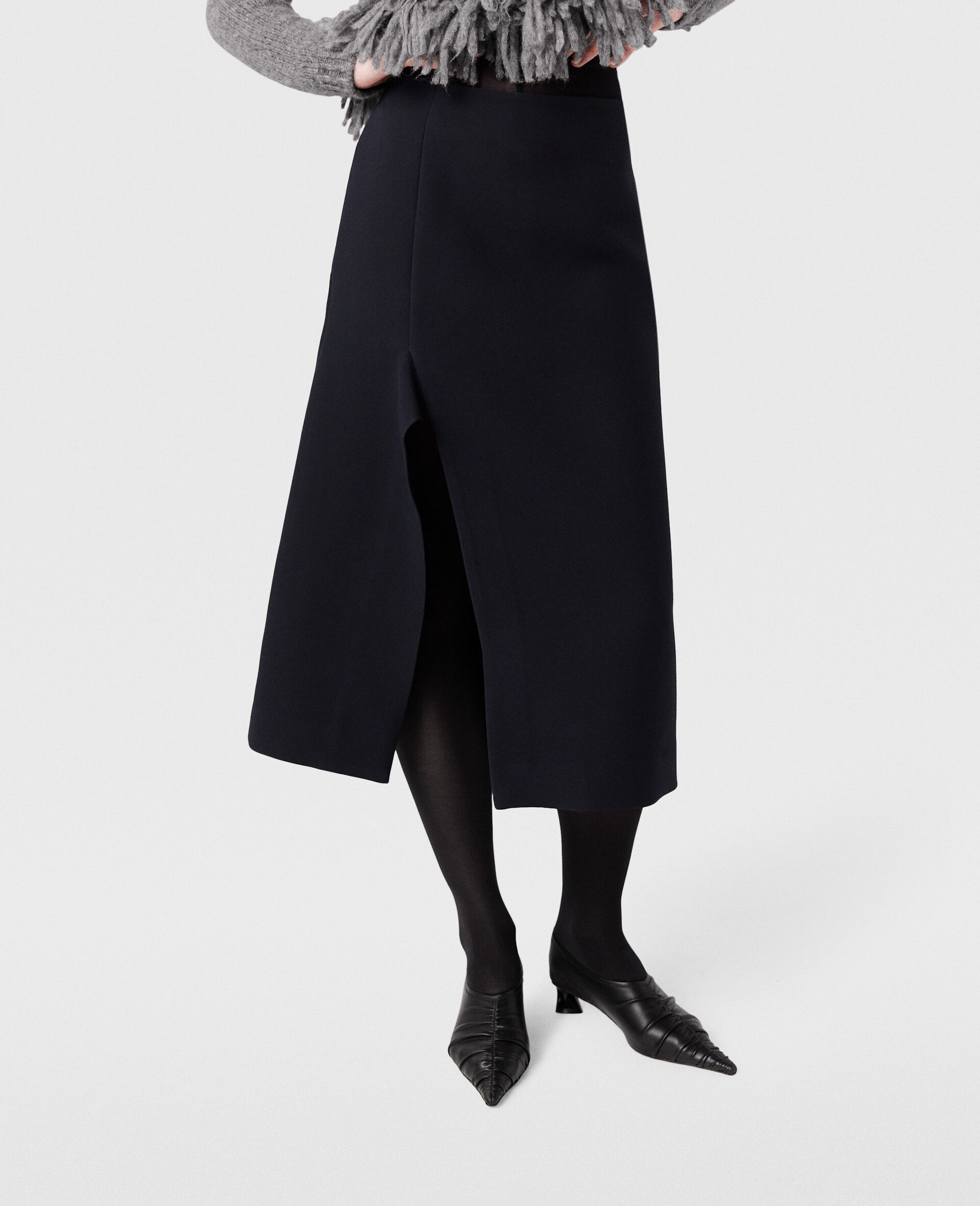 Item 6301113EU6001000 Spun from a soft, structured blend of organic cotton and silk, this sculptural skirt begins at a high-rise waist, skimming the hips and thighs before kicking out at a flared slit by the knee. Slip it on with some kitten heels and enjoy how its architectural outline bounces with each step. - Color: Black - Midnight black - High rise - Flat waistband - Slit at front right side - Kick-flared skirt - A-line - Zipper fastening - Calf-length hemline - Made in Italy Product Care & Fit Advice Care: Dry clean only Composition: Main fabric: 82% cotton 8% silk - Size: Fits true to size - Designed for a regular fit - Midweight, non-stretch fabric