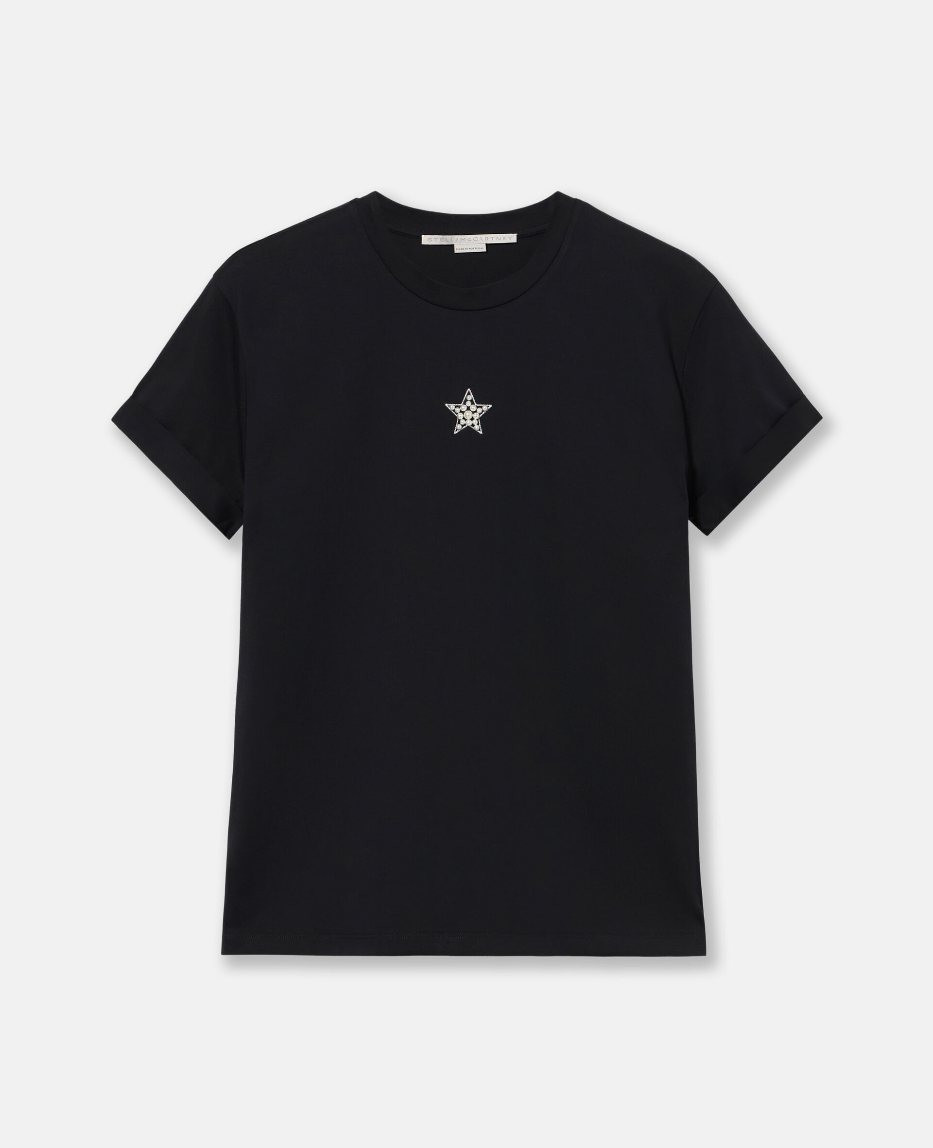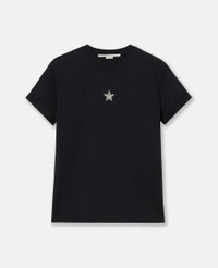 Item 6J01733SPX671000 Size: Fits true to size Designed for a regular fit Lightweight, slight-stretch fabric - Colour: Black - Pitch black - Boxy fit - Short sleeves - Ribbed crewneck - Lead-free crystal star on chest - Slips on - Made in Portugal Product Care & Fit Advice Stars are in Stella McCartney’s design DNA. You will find this one set in glimmering lead-free crystals, front-and-centre of this minimal, black cotton t-shirt. Slip it on with the iconic low-rise, cut-out jeans for a head-to-toe star-studded look. Care: Machine washable at 30°C Composition: Main fabric: 100% cotton