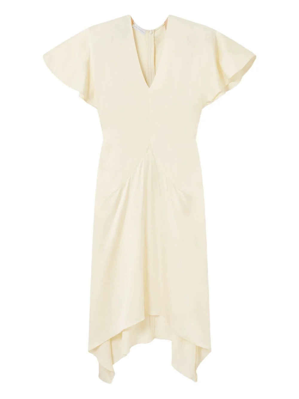 v-neck short-sleeves satin midi dress Highlights - Beige - V-neck - Short-sleeves - Handkerchief hem - Zip-fastening Made in Italy Composition Bio Acetate 73%, Viscose 27% Washing instructions Dry Clean Only