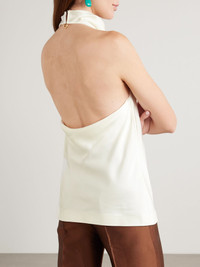 There's such understated elegance to Stella McCartney's top. It's cut with a halterneck from smooth, lustrous satin that drapes gorgeously. Turn to look over your shoulder in photos to highlight the low back. Size & Fit - Fits true to size, however those who are between sizes should take the smaller size - Cut for a slightly loose fit - Mid-weight, non-stretchy fabric - Model is 177cm/ 5'10" and is wearing an IT 40 Model measurements: - Bust: 85cm/ 33” - Waist: 66cm/ 26” - Hip: 92cm/ 36” Details & Care - Cream satin - Hook fastening at neck - 73% acetate, 27% viscose - Unlined - Dry clean