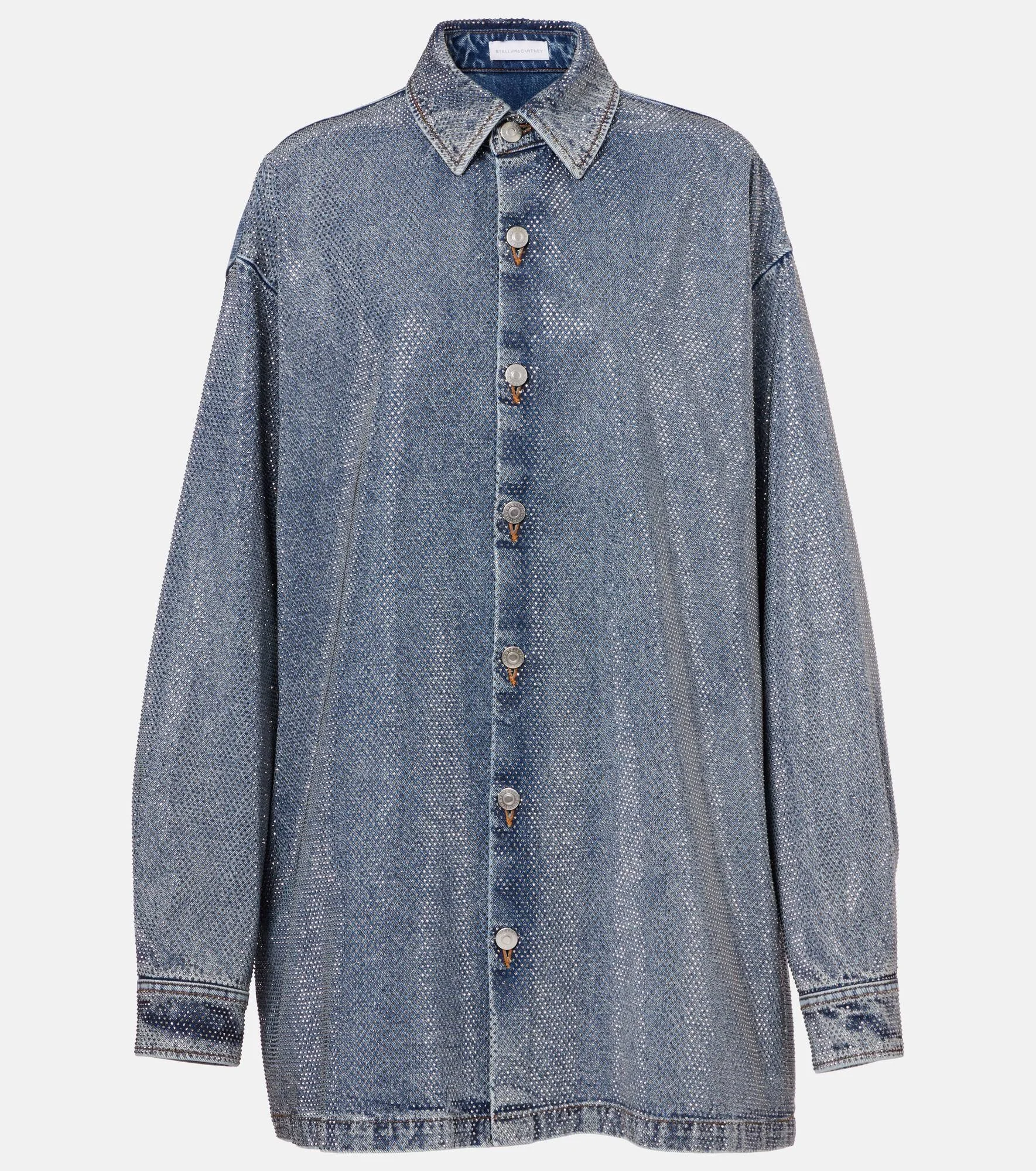 Innovative materials and conscious design – Stella McCartney redefines modern luxury with clarity, confidence, and uncompromising style. The Hotfix shirt is made from embellished denim and is finished with side slit pockets. Product Details - Material: 100% cotton - Care instructions: hand wash - Made in Italy - Designer color name: Vintage Blue Denim - Item color: blue - Dye: medium - Pockets: side slit pockets - Pocket lining: 100% cotton - Closure: buttoned front - Includes: dust bag - Item number: P01039303 Size & Fit - True to size - Dropped shoulders - Oversized - Non-stretchy fabric - Falls below the hip - The model seen in the picture is 178cm-5'10" and wearing a size XS