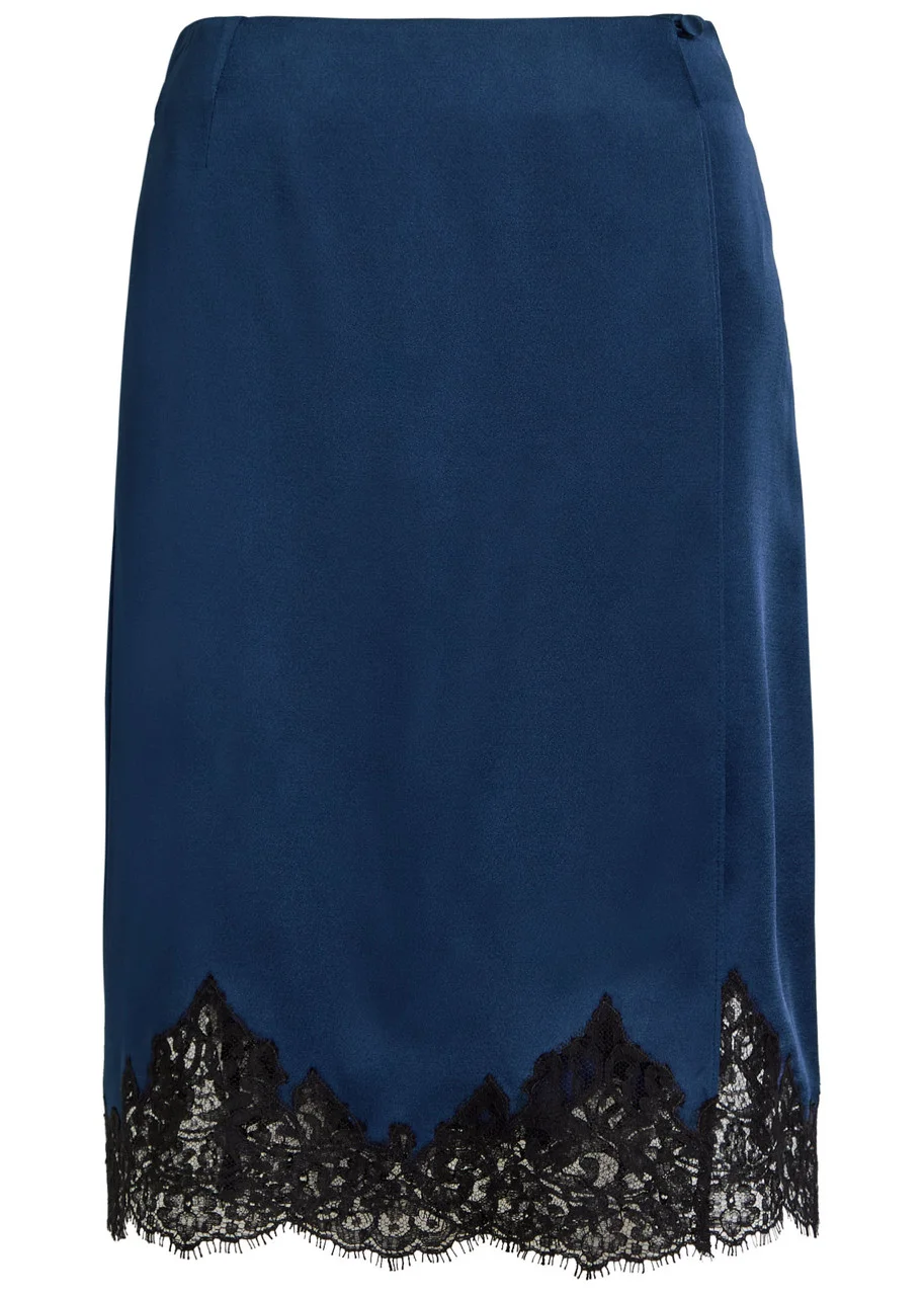 Info & Care Stella McCartney satin skirt Scalloped floral lace hem with eyelash trim Concealed button fastenings at wrap front 73% acetate, 27% viscose Dry clean Coordinating items available Size & Fit Length waist to hem: 22.5 inches/ 57cm Midweight Regular fit, straight cut Model is 5'9"/ 175cm and wears a size;IT40