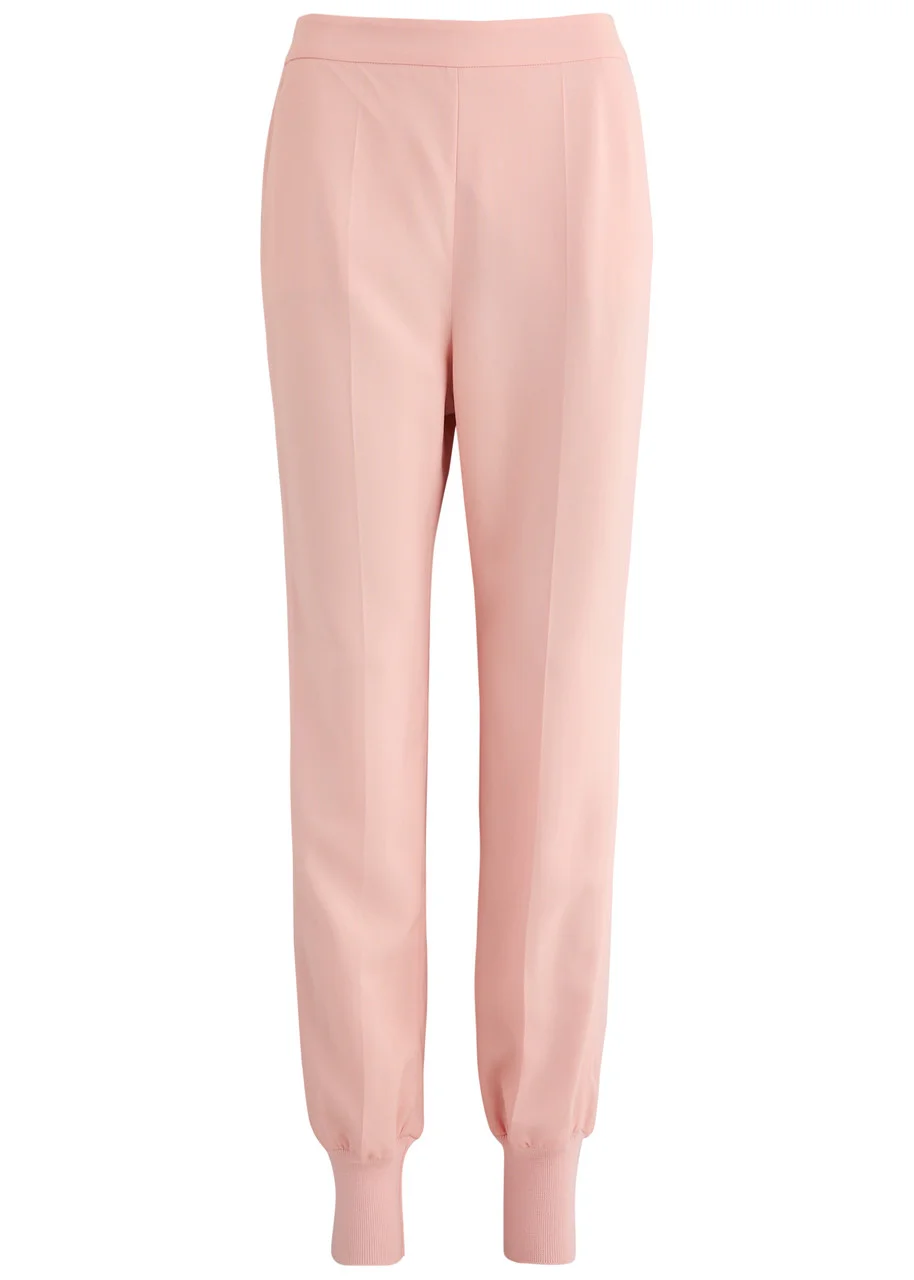 Info & Care Stella McCartney woven joggers Elasticated back waistband, side slip pockets, pressed crease through legs, ribbed-knit cuffs Pull on Fabric 1: 94% viscose, 4% elastane; fabric 2: 98% cotton, 1% elastane, 1% polyamide Dry clean Size & Fit Inside leg length: 29 inches/ 73.5cm Midweight Relaxed tapered-leg fit Model is 5'9"/ 175cm and wears a size IT40
