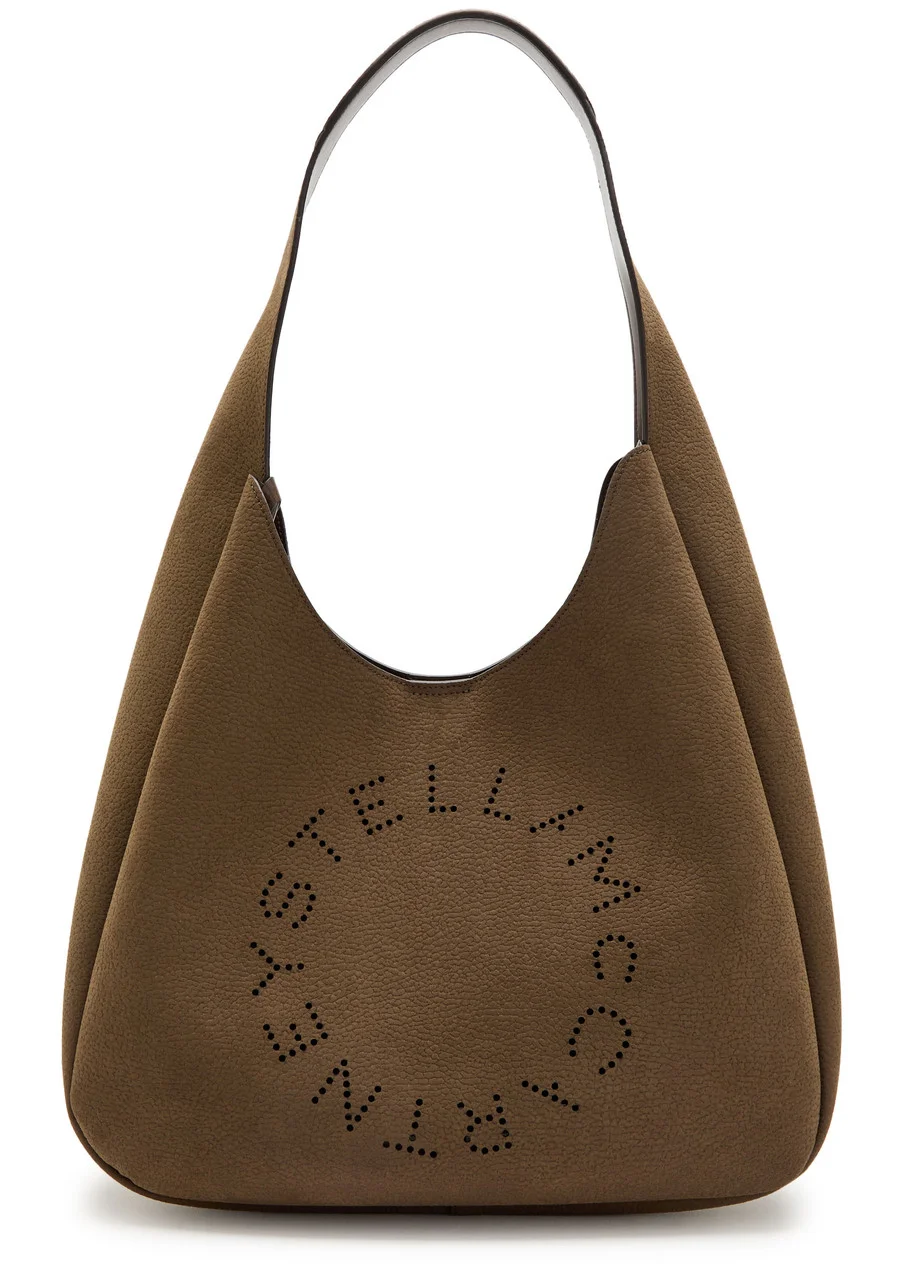 Info & Care Stella McCartney faux suede shoulder bag; Shoulder strap, perforated logo, internal patch pocket, faux leather lining; Concealed magnetic press-stud fastening at open top; Size & Fit Width: 14 inches/ 35.5cm; Height: 13 inches/ 33cm; Depth: 4.5 inches/ 11.5cm; Shoulder strap drop: 12 inches/ 30.5cm;