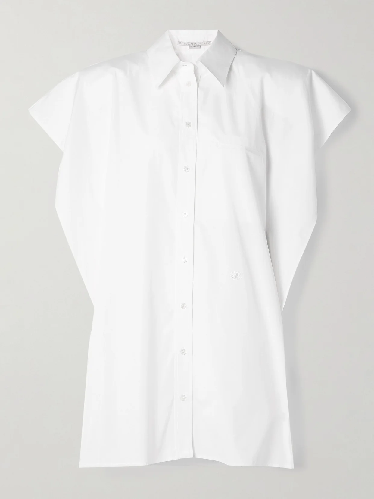 Stella McCartney's shirt dress is cut for an oversized fit that's emphasized by dramatic shoulder pads and cascading sleeves. It's cut from organic cotton-poplin embroidered with a tonal logo and can be styled solo or worn with pants. Lower-Impact Materials. This product is made using at least 50% lower-impact materials or ingredients. Find out more about our NET SUSTAIN criteria here.