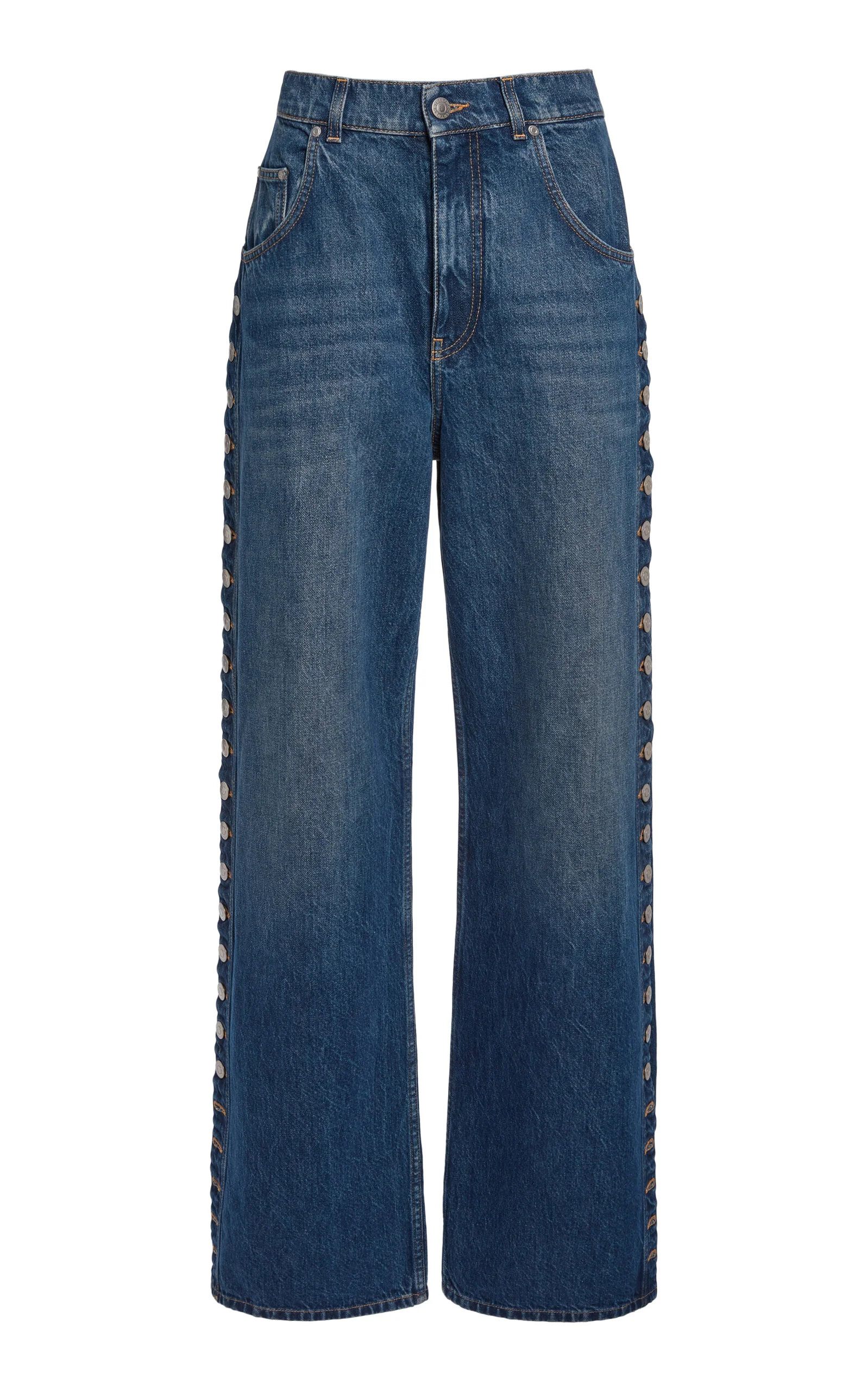 PRODUCT DETAILS - Low-rise, wide-leg, buttons along side - Button and concealed zip fastening - Composition: 100% Cotton F: 100% Cotton A: 100% Metallo - Color: medium wash - Dry clean only - Fall/Winter '25