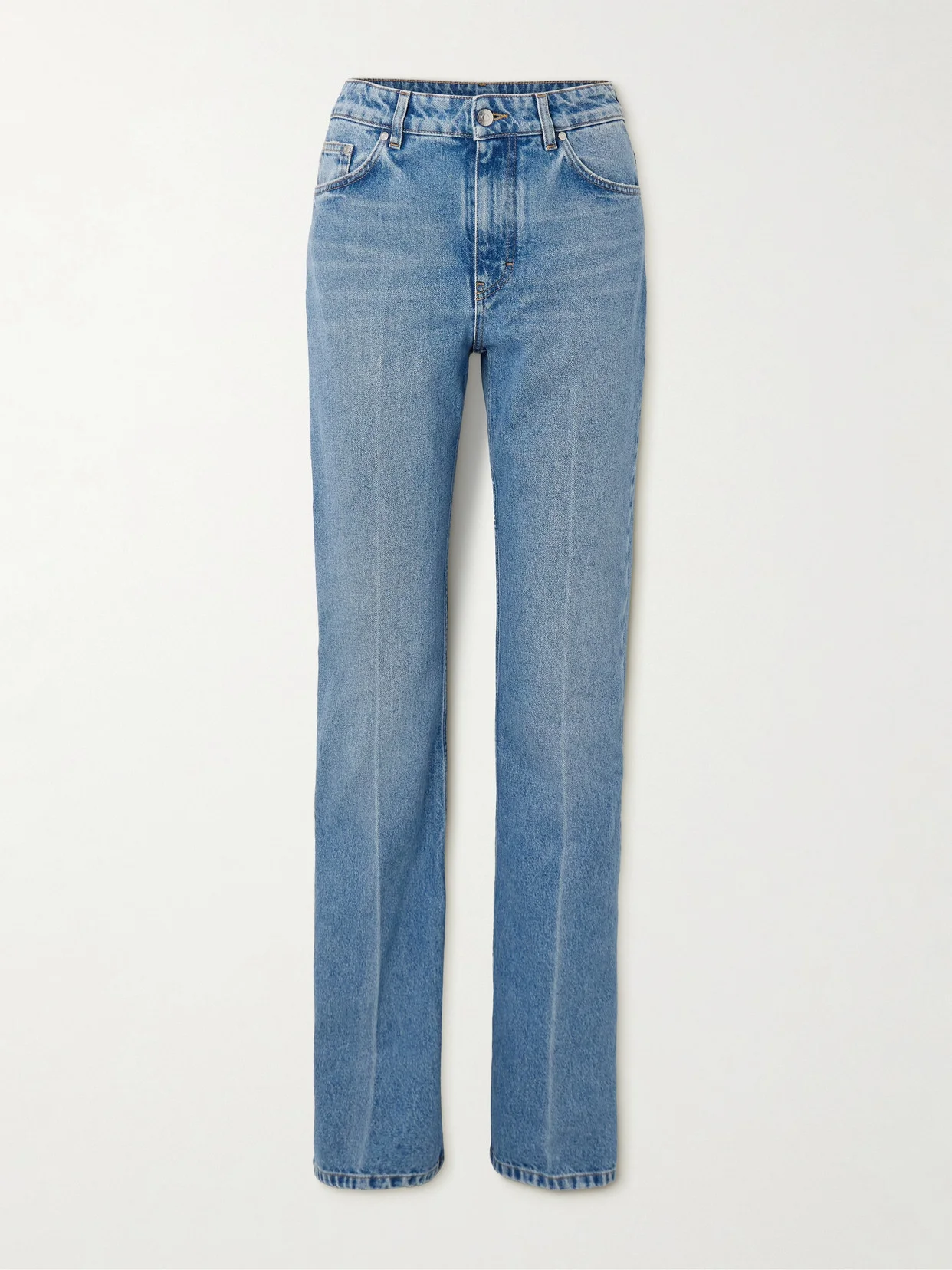 Stella McCartney's jeans are made from certified organic denim that's faded and whiskered for an authentic, worn-in feel. Designed to sit high on the waist, they have a classic five-pocket construction and straight legs with elongating pressed creases. Lower-Impact Materials. This product is made using at least 50% lower-impact materials or ingredients. Find out more about our NET SUSTAIN criteria here.