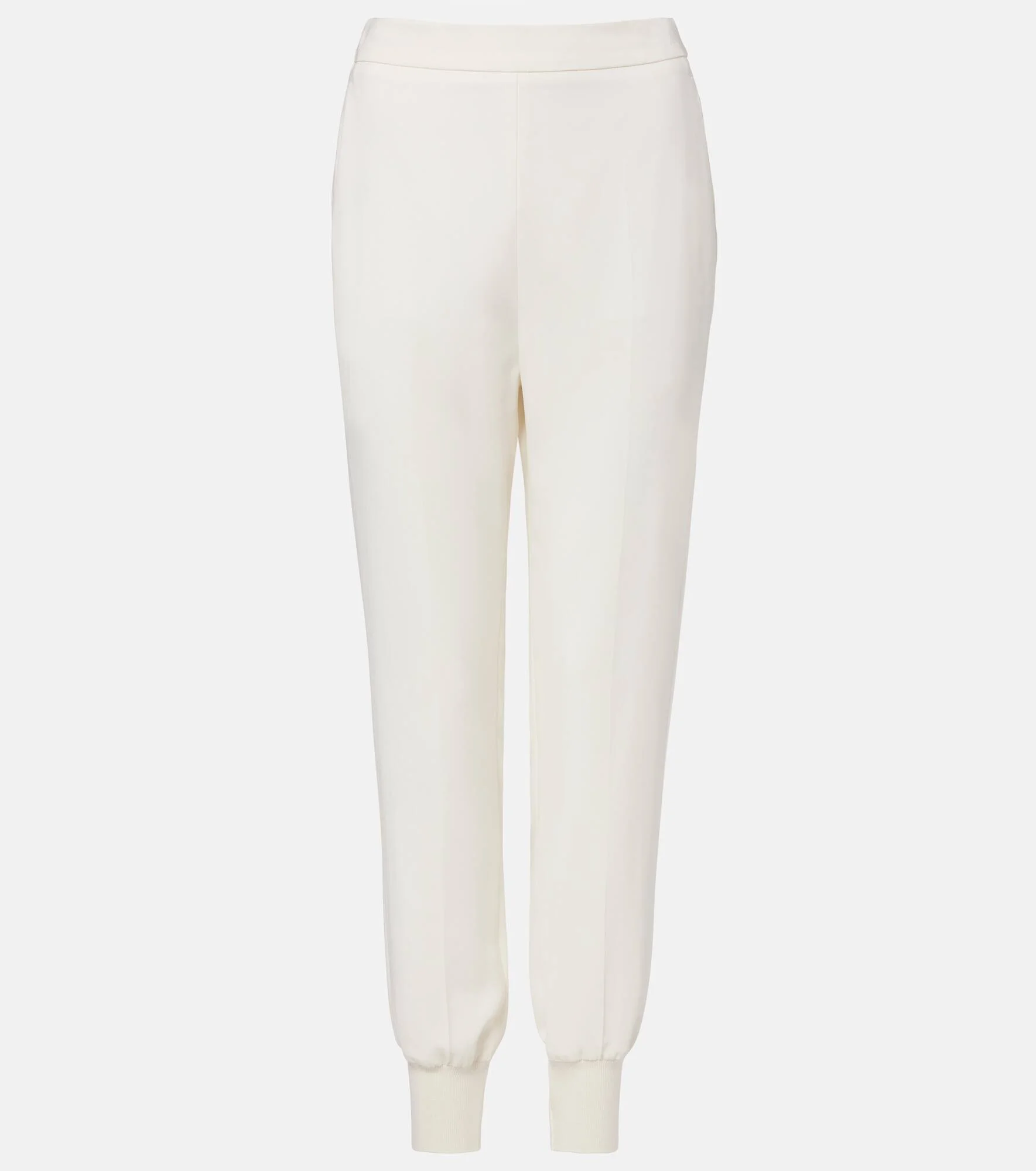 These Stella McCartney sweatpants offer a blend of casual ease and refined edge. This pair features a mid-rise waist, tapered legs with center pleats, and an elasticated waistband for added comfort. Product Details - Material: 96% viscose, 4% elastane - Care instructions: dry clean - Made in Romania - Color: white - Designer color name: White - Trim: 98% cotton, 1% elastane, 1% polyamide - Elasticated waistband - Pockets: slant pockets - Item number: P01132533 Size & Fit - True to size - Elasticated waist - Non-stretchy fabric - Tapered leg - The model seen in the picture is 178cm-5'10" and wearing a size IT 40
