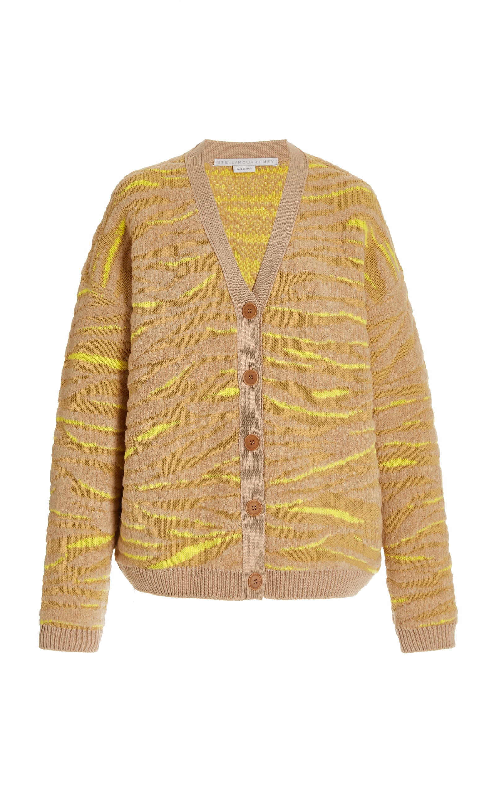 For Pre-Fall '21, Stella McCartney doubled down on her brand's initiatives last season involving an even bigger push for sustainability in the future. At 80% sustainable and accompanied by a look-by-look breakdown of the sustainability built-in each garment and accessory (which includes upcycled and overstock fabrics), this collection delivers. This button-front cardigan has a comfortably oversized fit knit from a textured jacquard-knit wool-blend with a vibrant animal pattern. Wear it casually with jeans or add the matching skirt for a bold finish. PRODUCT DETAILS - Button fastenings through front - Composition: 80% virgin wool, 20% polyamide - Dry clean - Made in Italy