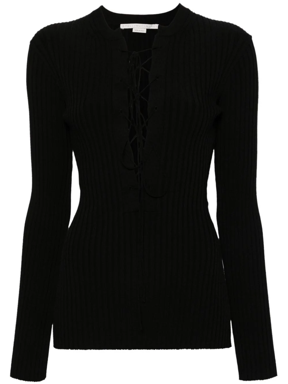 lace-up ribbed jumper Highlights - Black - Wide ribbed - Round neck - Front lace-up fastening - Long sleeves - Straight hem Made in Italy Composition Viscose 83%, Polyester 17% SIZE & FIT Model measurements Height 5 ft 10 in(1.78 m) Bust/Chest 33.46 in(85 cm) Hips 36.22 in(92 cm) Waist 23.22 in(59 cm) FittingInformation Designed for a close fit throughout The adjustable drawstring means that you can adjust this piece’s fit to suit your comfort and preference This piece fits true to size – take your usual size
