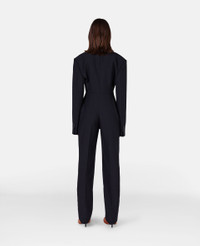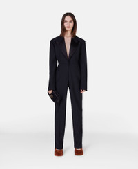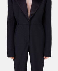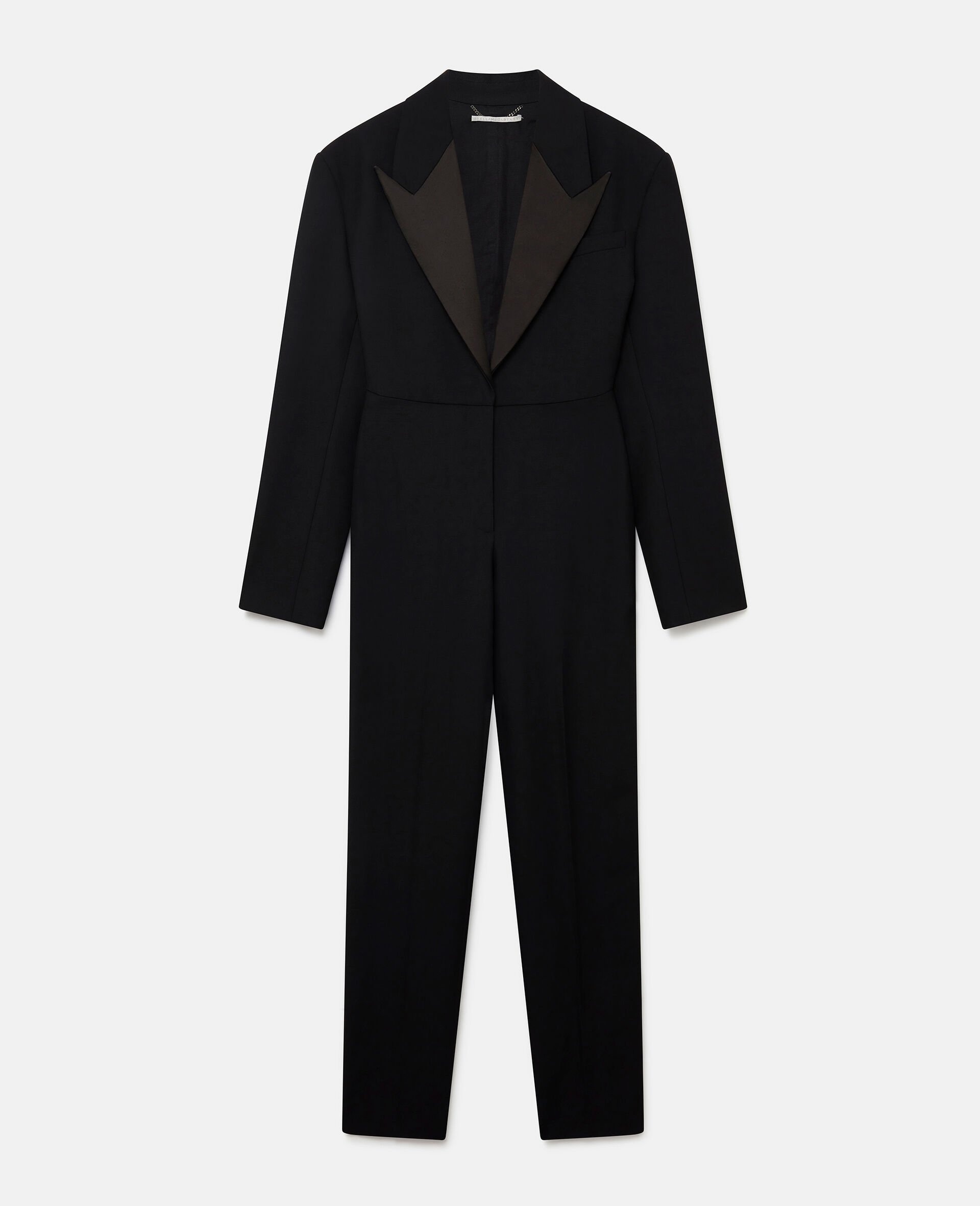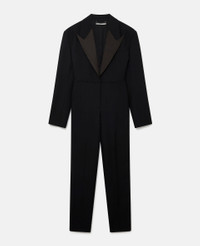 Iconic Savile Row tailoring elevates this black jumpsuit from Stella McCartney. The all-in-one is responsibly made from RWS wool tailoring fabric with a sharp peaked lapel and signature padded shoulders. A moulded, nipped-in waist nods to this season's key silhouette. - Colour: Black - Midnight black - RWS wool tailoring fabric - Peaked lapel - Padded shoulders - Long sleeves with waterfall button cuffs - Nipped-in waist - Button fastening - Tapered leg - Made in Italy Product Care & Fit Advice - Care: Dry clean only - Composition: 100% wool - Fits true to size - Designed for a regular fit - Mid-weight, non-stretch fabric