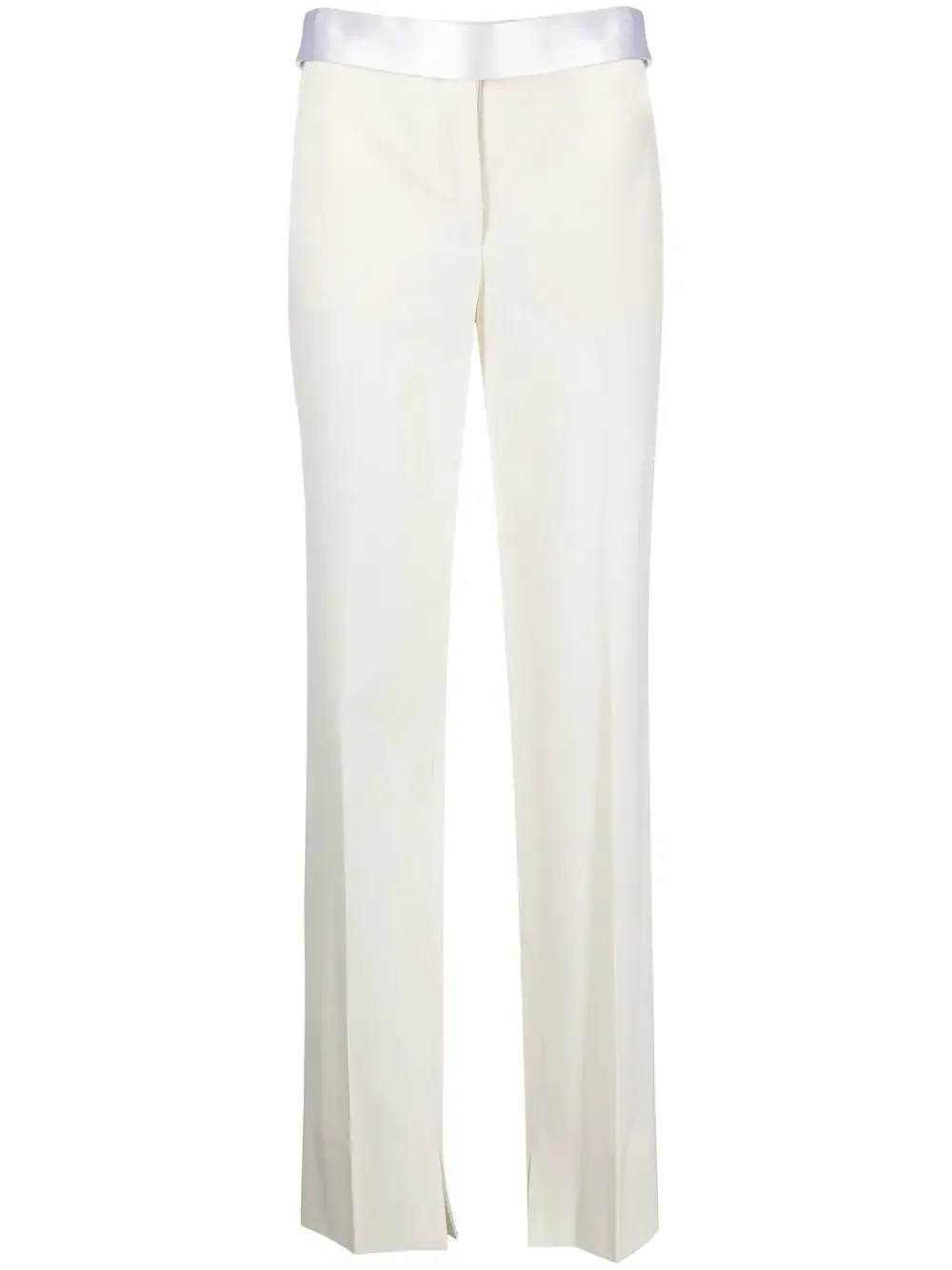 satin-waistband detail trousers Highlights - Cloud white - Wool-silk blend - Pressed crease - Satin waistband - Concealed front fastening - Two side inset pockets Imported Composition Outer: Viscose 72%, Recycled Polyester 53%, Wool 43%, Silk 28%, Elastane 4% Lining: Viscose 60%, Recycled Polyester 40% SIZE & FIT Model measurements Height 5 ft 11 in(1.8 m) Bust/Chest 31.49 in(80 cm) Hips 35.82 in(91 cm) Waist 24.8 in(63 cm) FittingInformation This piece fits true to size. We recommend you get your regular size Designed to be fitted at the waist and hips, loose over the leg Made with a mid-weight fabric Washing instructions Dry Clean Only