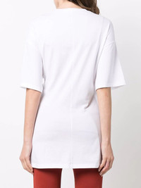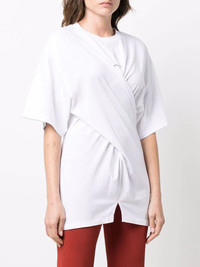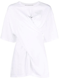 twist logo print T-shirt Stella McCartney reinvents the classic logo tee with a twist detail on this sustainable cotton shirt, cut for a relaxed fit that embodies the brand's casual approach to AW22. Highlights - White - Sustainable cotton - Twist detailing - Logo print to the front - Half-length sleeves - Round neck - Straight hem Imported Composition Cotton 100% SIZE & FIT Model measurements Height 5 ft 9 in(1.75 m) Bust/Chest 32.67 in(83 cm) Hips 36.22 in(92 cm) Waist 24.8 in(63 cm) FittingInformation This piece fits true to size. We recommend you get your regular size Cut for a slim fit Made with a mid-weight fabric Washing instructions Dry Clean Only