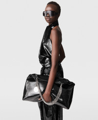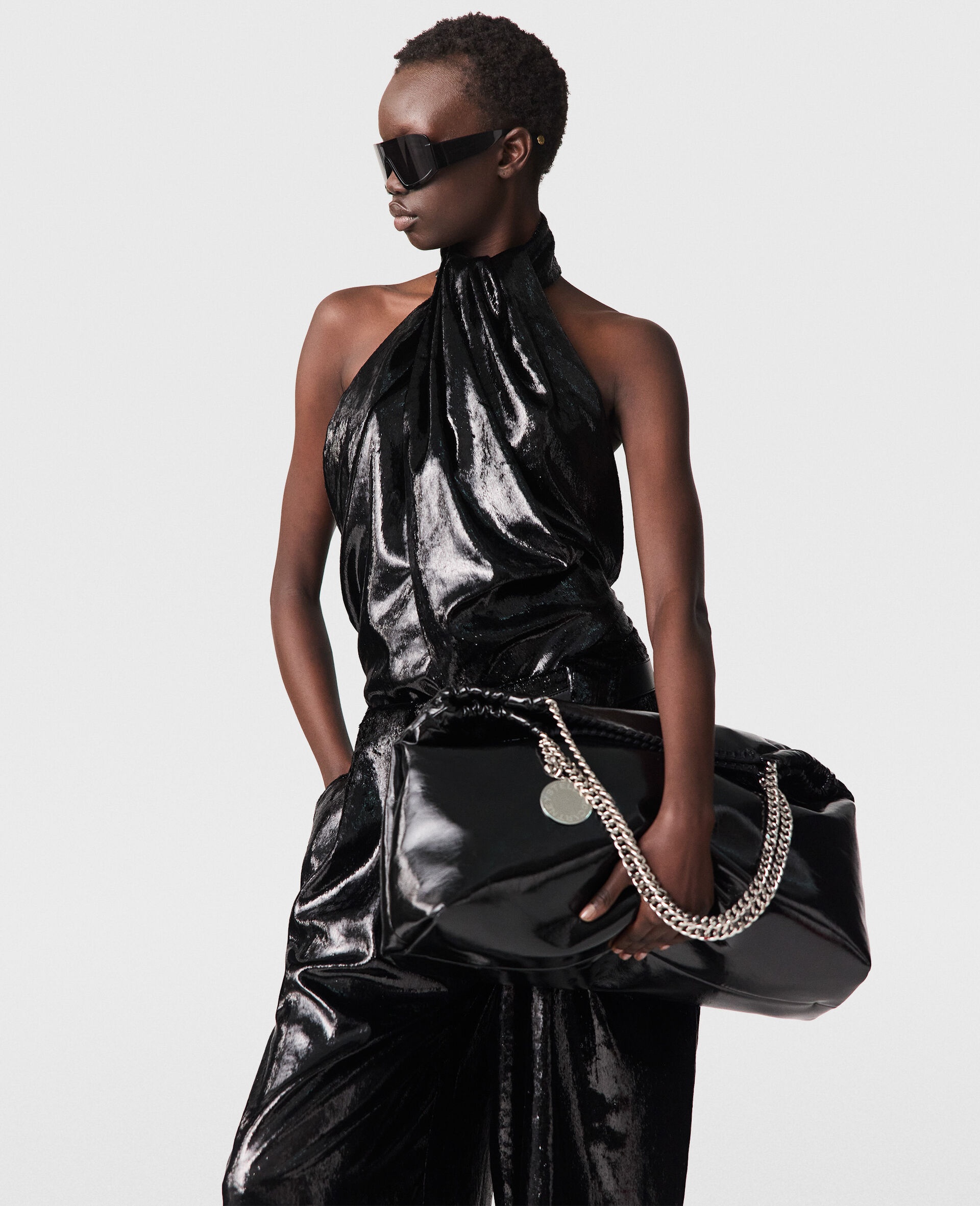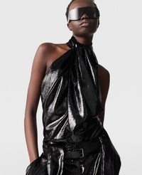 Item 6T02383FU3621000 Spun from recycled polyester velvet, this slinky top begins with a wrapped halterneck split into two panels. Cascading straight past hips to a split above the waistline, it pairs perfectly with the coordinating pants. - Color: Black - Halterneck - Wrapped panel from neckline down - Split above waistline - Velvet texture - Zipper fastening - Made in Italy Product Care & Fit Advice - Care: Dry clean only - Composition: 100% Polyester - Fit: Fits all phones and wallets alongside daily essentials. - Size: 26.5 x 23.5 x 10cm - Handle drop: 11cm - Strap length: 47cm - Weighs approximately: 0.755kg - Model wears a size 40 IT or 8 UK