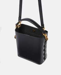 Item 7B0093WP03801000U Luxury meets innovation in this sleek silhouette. Handcrafted from strips of butter-soft, smooth UPPEAL™ – Stella McCartney’s apple-based vegan alternative to animal leather – this compact bucket silhouette is best slung across a sustainable ensemble, or over the shoulder. - Colour: Black - Midnight black - Comfortably fits all phones and small daily essentials. - UPPEAL™ vegan alternative to animal leather sourced from apple waste - Whipstitch lacing on either side - Waxed GOTS-certified organic cotton lacing - One top handles - One adjustable crossbody strap - Magnetic snap fastening main compartment - One internal slip pocket - Logo-engraved medallion made from zero-waste zamac - Apple-shaped charm on strap - Handcrafted in Italy Product Care & Fit Advice Do not wash or clean. Avoid scrubbing to prevent damaging the surface of the bag. As this accessory is made from very delicate material, we recommend handling with care and avoiding contact with any sharp objects, jewellery or rough surfaces. When not in use, always store the item in its protective bag. Composition: 56% polyester, 44% cotton Fits all phones and small daily essentials. Size: 18 x 17.5 x 8cm Handle drop: 52cm Strap length: 55cm Weighs approximately 0.27kg All Stella McCartney shoes and accessories are made from non-leather materials in keeping with our cruelty-free ethos.