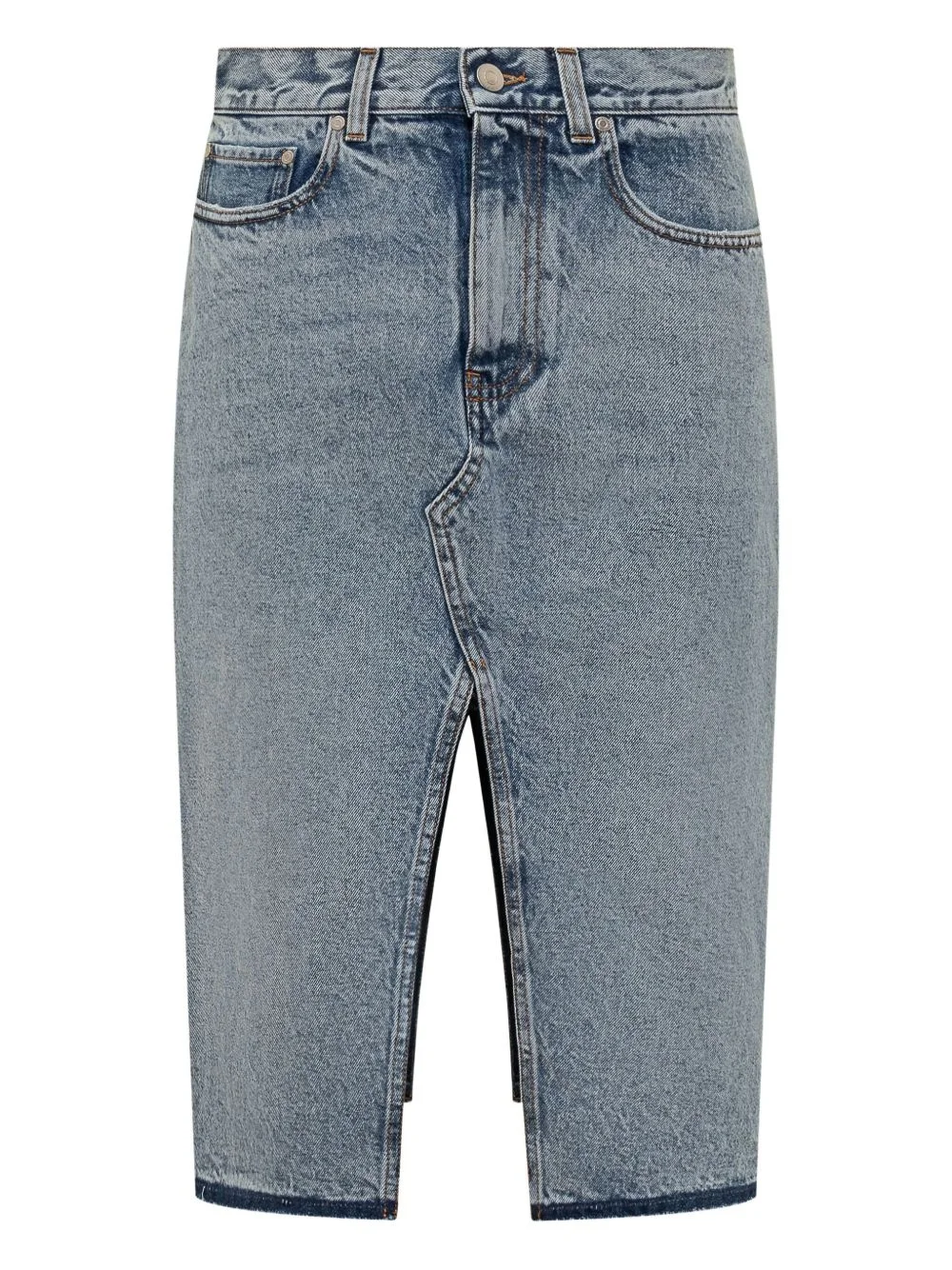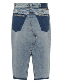 asymmetrical denim skirt Highlights - Light blue - Front slit - Zippered back pockets - Contrasting denim panels - Logo detailing Made in Italy Composition Cotton 100%