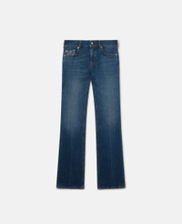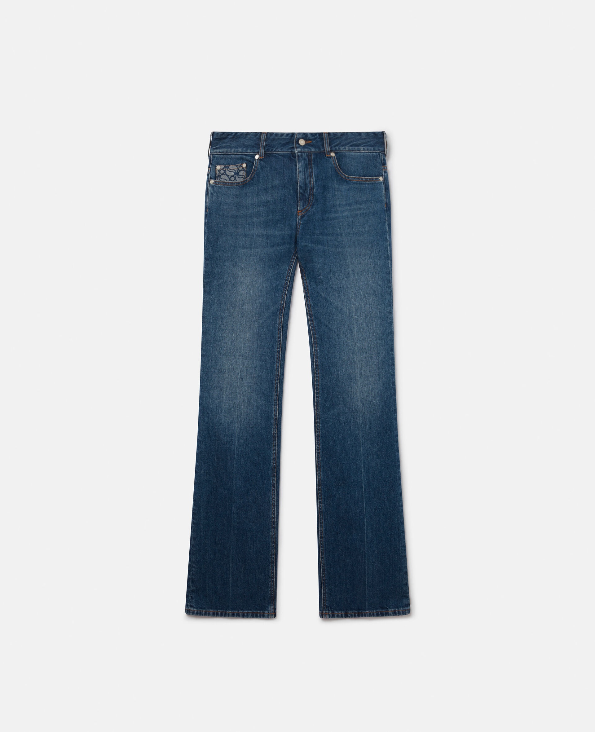 - Colour: Vintage Dark - Medium denim blue - Organic cotton denim - Vintage-effect wash at thighs - Stella McCartney monogram on coin pocket - Stella McCartney logo patch at back - Button and zip fly - Belt loops - Five-pocket design - Low-rise, straight leg - Made in Italy Product Care & Fit Advice - Care: Machine washable at 30°C - Composition: Main fabric: 98% organic cotton, 2% elastane, Contrast: 100% cotton, Secondary fabric: 55% polyester, 45% organic cotton