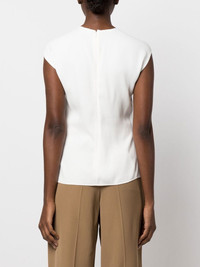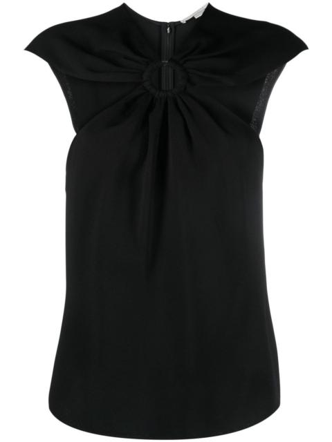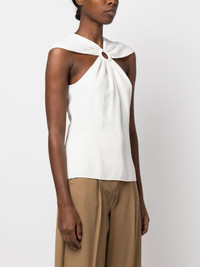 ring-hardware cold-shoulder T-shirt This cold-shoulder design from Stella McCartney benefits from ring hardware detailing at the chest that is paired with a gathered construction to create a V-neck silhouette. Highlights - White - Sustainable viscose - Ring hardware detailing - V-neck - Cold-shoulder design - Gathered detailing - Straight hem Made in Italy Composition Viscose 96%, Spandex/Elastane 4% SIZE & FIT Model measurements Height 5 ft 10 in(1.78 m) Bust/Chest 31.49 in(80 cm) Hips 37 in(94 cm) Waist 23.62 in(60 cm) FittingInformation This piece fits true to size. We recommend you get your regular size Cut for a slim fit Made with a mid-weight fabric Washing instructions Dry Clean Only