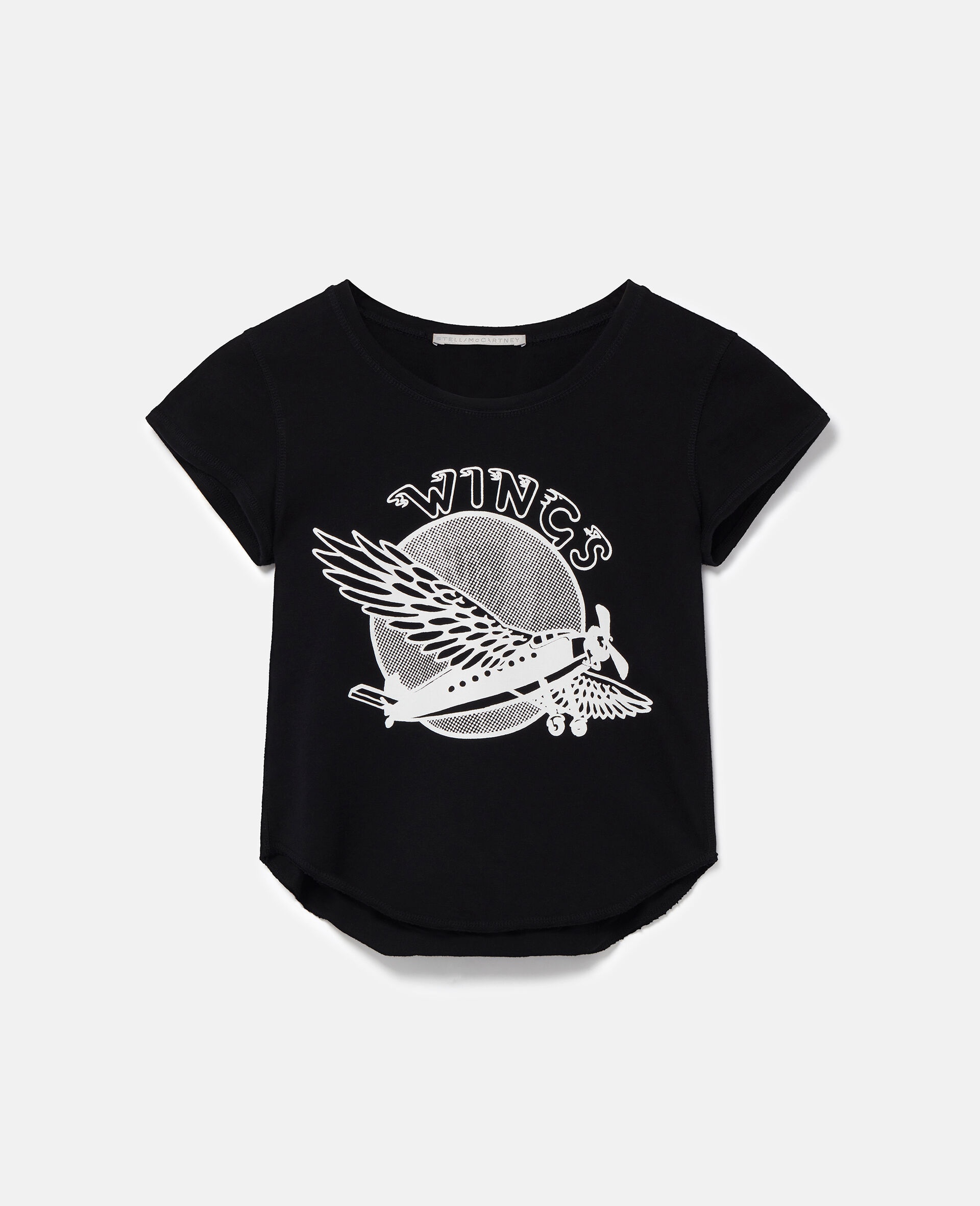 Item 6J02843SPZ121000 Inspired by Stella McCartney’s legendary parents and their lives on tour, this baby tee is cut from fully traceable organic cotton and printed with a vintage Wings graphic – pulled from the band’s archives and tour merchandise. Dress it down with some denims or slip it under a suit jacket. - Colour: Black - Midnight black - Pure cotton jersey - Wings graphic printed across front - Crew neck - Ribbed trims - Short sleeves Product Care & Fit Advice Machine washable at 30°C Composition: Main fabric: 100% organic cotton Size: Fits true to size Designed for a snug fit Midweight, stretch fabric