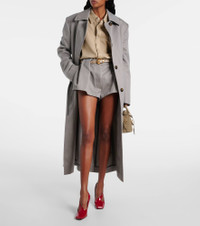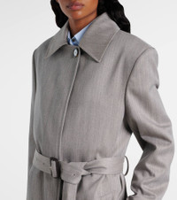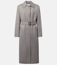 This wool-blend coat from Stella McCartney features a sleek, sophisticated silhouette with concealed button closure, a structured collar, and belted waist. The design is completed with shoulder pads for added structure and sharp definition. Product Details - Material: 56% wool, 44% polyester - Care instructions: dry clean - Made in Hungary - Designer color name: Light Stone - Item color: gray - Fully lined - Lining: 52% viscose, 48% cotton - Material II: 100% polyester - Contains non-textile parts of animal origin - Item number: P01039301 Size & Fit - True to size - Shoulder pad inserts - Loose fit, comes with belt - Non-stretchy fabric - slit length 57cm-22.5" - The model seen in the picture is 178cm-5'10" and wearing a size IT 40