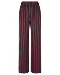 The Elasticated Long Pants in Navy and Burgundy Wallpaper Stripes by Stine Goya are wide-leg pants featuring a striped pattern in deep navy and burgundy tones, finished with contrast stitching along the side seams, elasticated waist, and side pockets. - 54% TENCEL™ Lyocell/46% Viscose - Hand wash