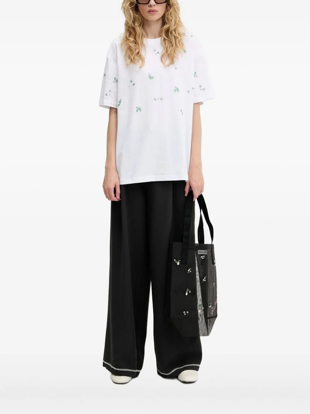 embellished floral-print T-shirt Highlights - White - Floral embellishment - Green and pink bead details - Short sleeves - Crew neck Imported Composition Organic Cotton 100% Washing instructions Read Manufacturer Guidelines