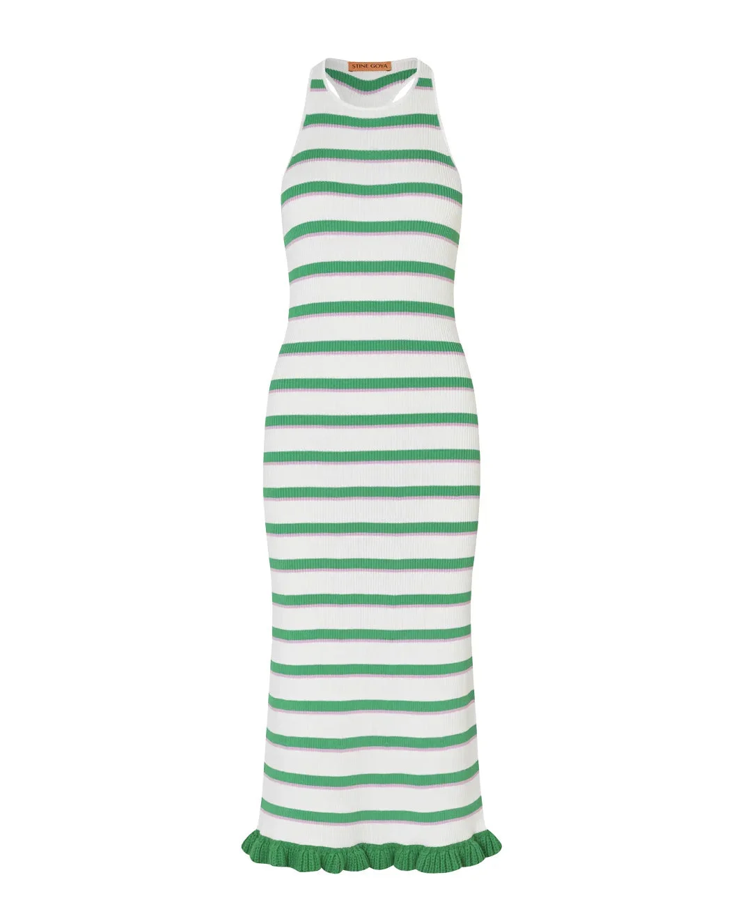 The Ruffle Tank Dress in Green and Pink Stripes by Stine Goya is a striped midi length knit dress with a green ruffle hem, featuring a racerback design and a fitted silhouette.