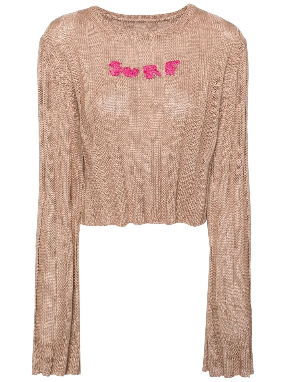 embroidered-motif linen jumper Highlights - Beige - Linen - Ribbed knit - Embroidered motif - Long sleeves - Short side slits - Cropped - Straight hem Imported Composition Linen/Flax 100%