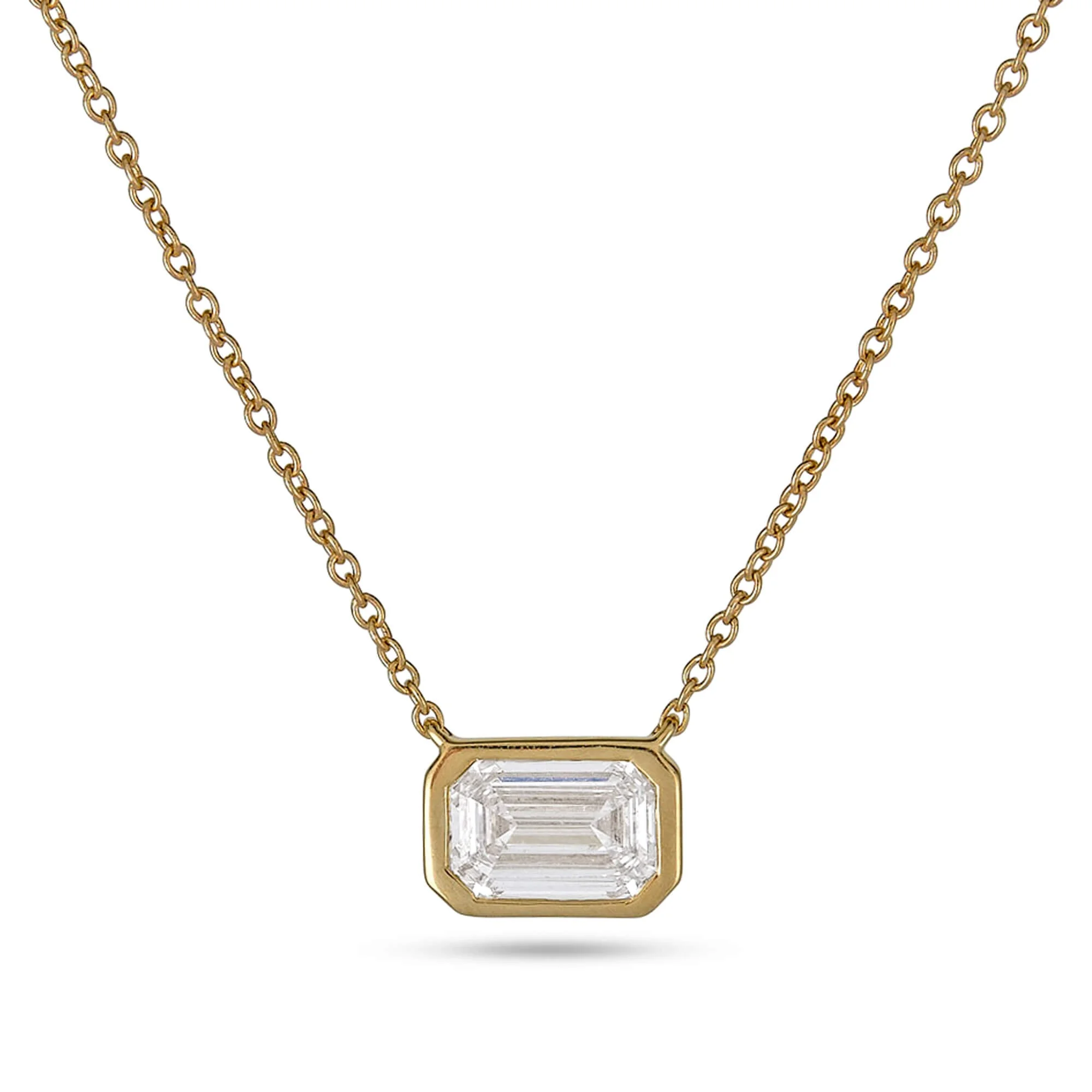 - Spring ring clasp closure - Bezel set - 14k Solid yellow gold - Diamond clarity: VS2 - Adjustable chain length: 16"-18" - All carat weights are approximate - Ethically sourced and sustainable materials - Cable chain thickness: 1 mm - Diamond color: EF - Hand selected LAB-grown white emerald cut diamond: 1.00 CTW (approx) Additional Information Not all sparkle is equal. Our lab-grown diamond jewelry is made sustainably, without the need for traditional mining. As prices fluctuate and the market shifts, lab-grown diamonds offer the best value. Our lab-grown styles are also made using recycled gold, helping to minimize waste created through the production process. We offer quality without complication with jewelry that doesn't just look good — you can feel good about wearing it.