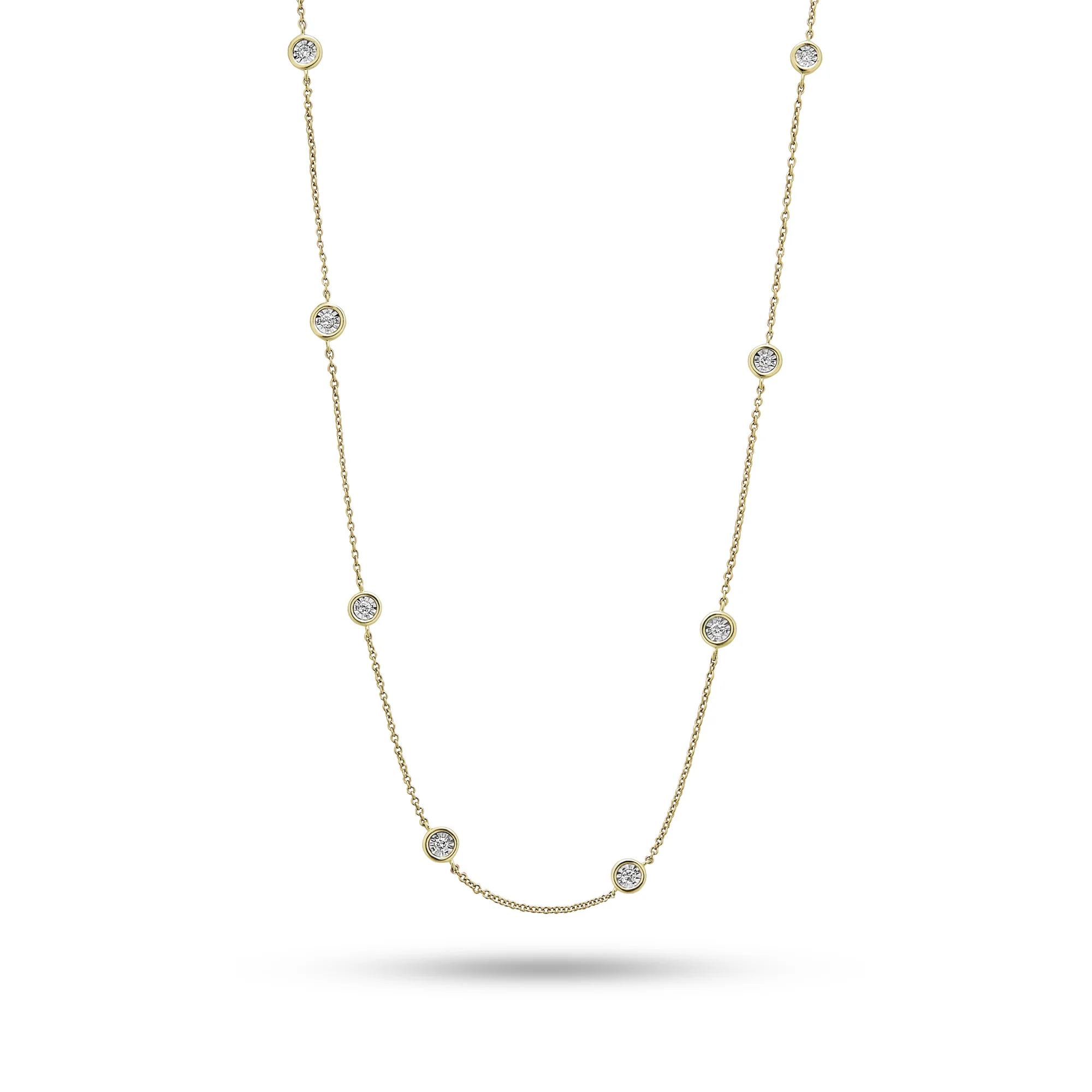 - Ethically sourced materials and conflict free diamonds - Adjustable chain length: 16"-18" - Fully compliant with The Kimberley Process - Trigger clasp closure - 10K Solid yellow gold - Illusion plate setting - Natural white diamonds: 0.11 CTW (approx) - Diamond quality: HI-I2 Additional Information Diamond jewelry is forever. That's why we focus on the details and great value when it comes to designing our pieces. You'll find sleek, modern styles with keen attention to balance and proportion — because they can't just look good now, they need to last. Designed in NYC, our jewelry uses 100% ethically-mined diamonds, set in solid gold to ensure no tarnishing or flaking.