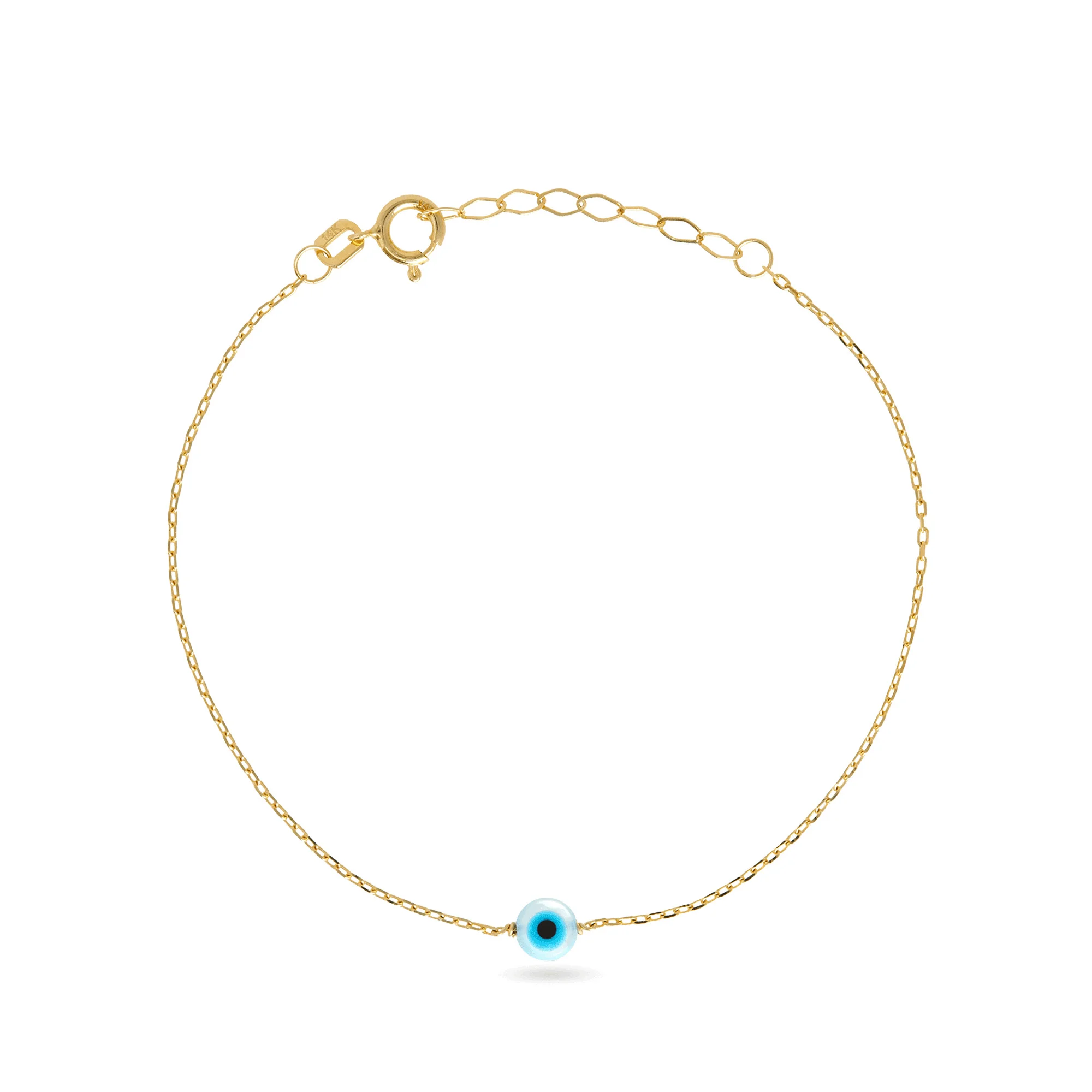 - 10k Solid yellow gold - Please note that all evil eyes are unique and colors / shape will vary slightly - Adjustable chain length: 6" - 7" - Resin black and turquoise eye - Mother of pearl evil eye carving Additional Information Infuse your jewelry collection with a little color. Our gemstone pieces are designed to add a splash of creativity and whimsy to your look. Since we use all-natural gems, each unique stone is cut to the perfect size and shape. Your piece is meant especially for you. As our gemstones are ethically earth-mined and collected only in quantities that we can source, our gemstone designs are always limited edition and handcrafted into something exceptional with the best value.