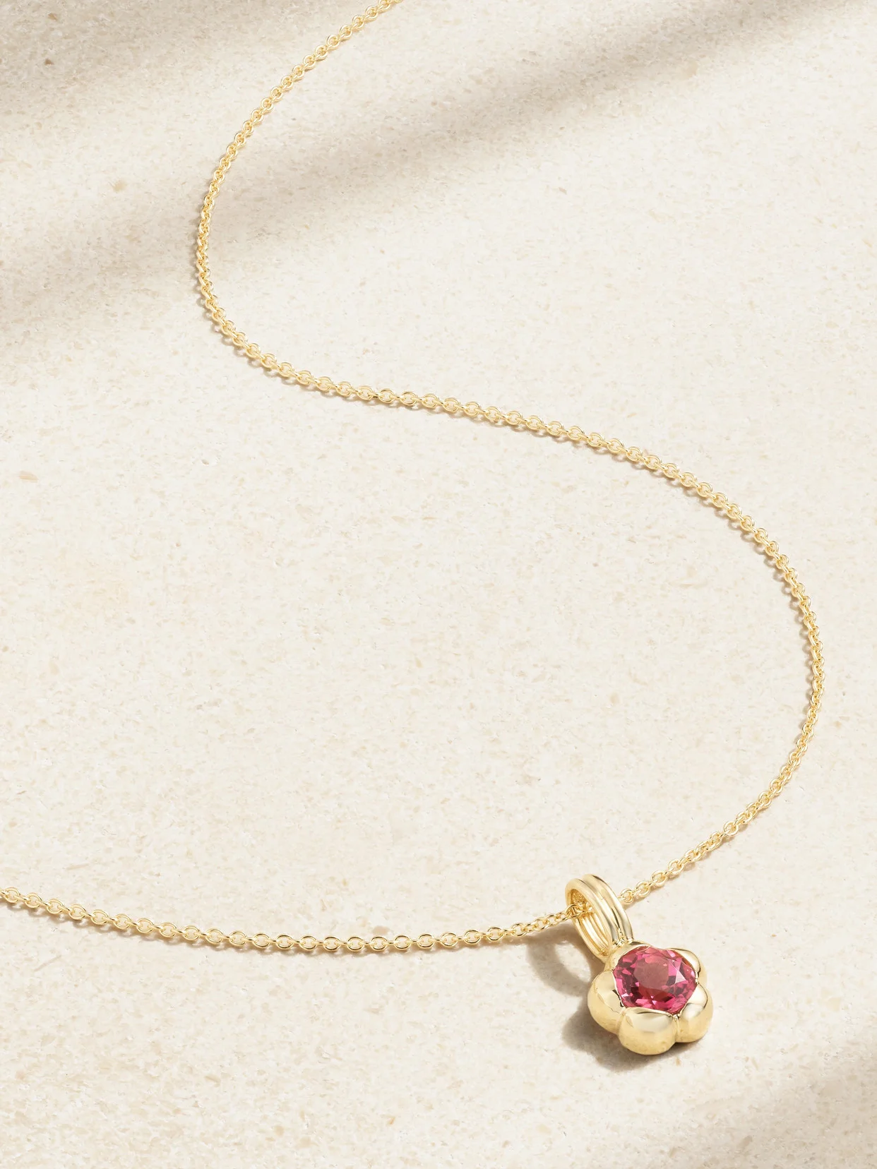 STONE AND STRAND's 'Festival' necklace is adorned with a pink tourmaline that represents love, compassion and healing. Handmade from 14-karat gold, it's nestled in a floral setting and strung on an adjustable chain perfect for layering.