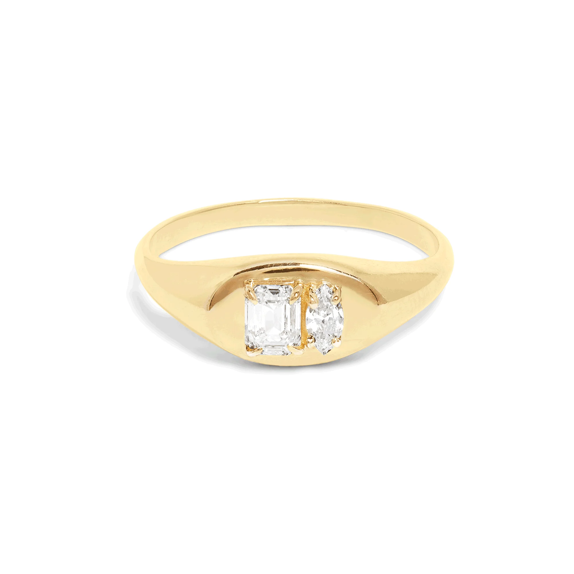 - 14K Solid yellow gold - Recycled gold - White Lab-created Marquise Diamond - White Lab-created Emerald Diamond - Quality/Color: EF VS / FG VS2 - Band width: 1.7mm - Signet face: 10 x 6.5mm - Approx 0.3CTW - Part of our Rathe™ collection