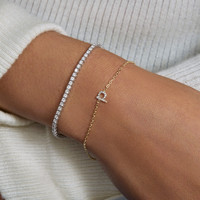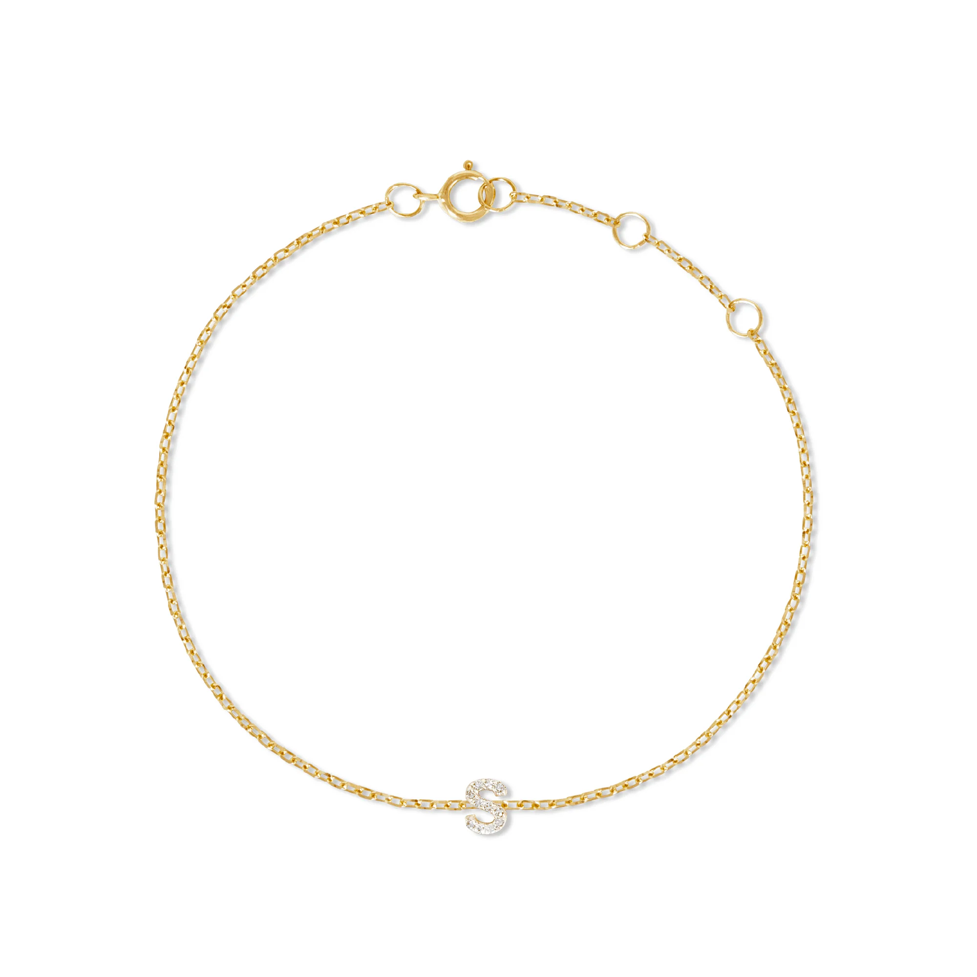 - 10k Solid yellow gold - 0.03CTW Pave white diamonds (approx) - Handpicked very good cut - Fully compliant with The Kimberley Process - Diamond color/clarity: GH/SI - Chain length: 6 - 7in adjustable chain - 5mm Initial (approx) - Ethically sourced materials and conflict-free natural diamonds - Partially finished with rhodium plating Additional Information Buying jewelry is a personal experience, and even more so when you're choosing a style that's customized to you. Whether it be including your initials, birthstone, or zodiac sign, investing in a luxurious solid gold or sterling silver piece designed and handcrafted just for you can make a purchase feel even more special. With great quality at the fairest prices, custom styles also make for great gifts as they're chosen specifically with the recipient in mind.